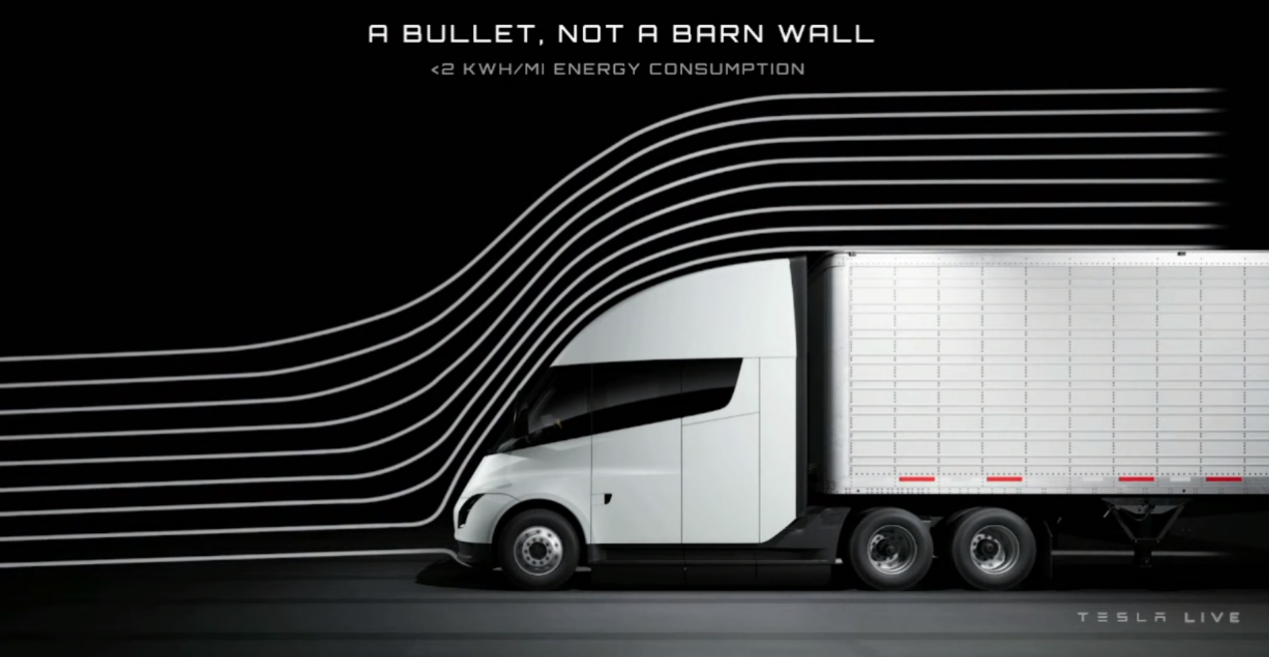 外观设计上,Semi完美呈现了特斯拉简洁、极客的风格,与像一堵墙的传统卡车相比,Semi更像一颗子弹。大尺寸前挡风玻璃与圆润饱满的前盖无缝衔接,营造出视觉流畅感受的同时,也带来了风阻系数0.36Cd的空气动力学表现。