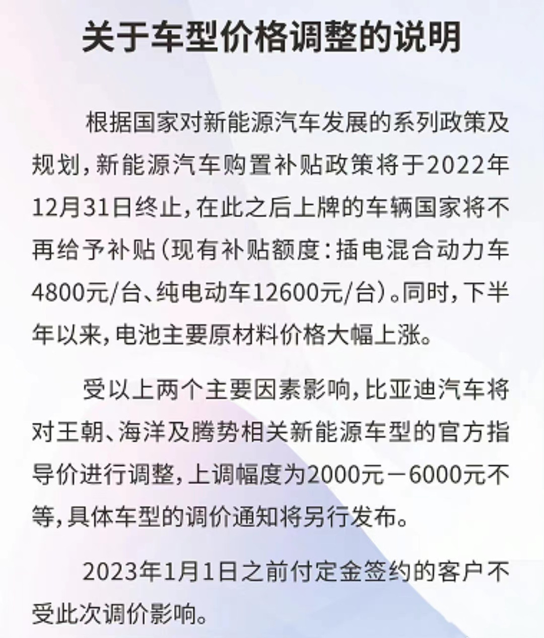 比亚迪是最早公布的一位,并提前通知将会对王朝、海洋、腾势等新能源车的价格进行调整,上调幅度为2000元-6000元不等。