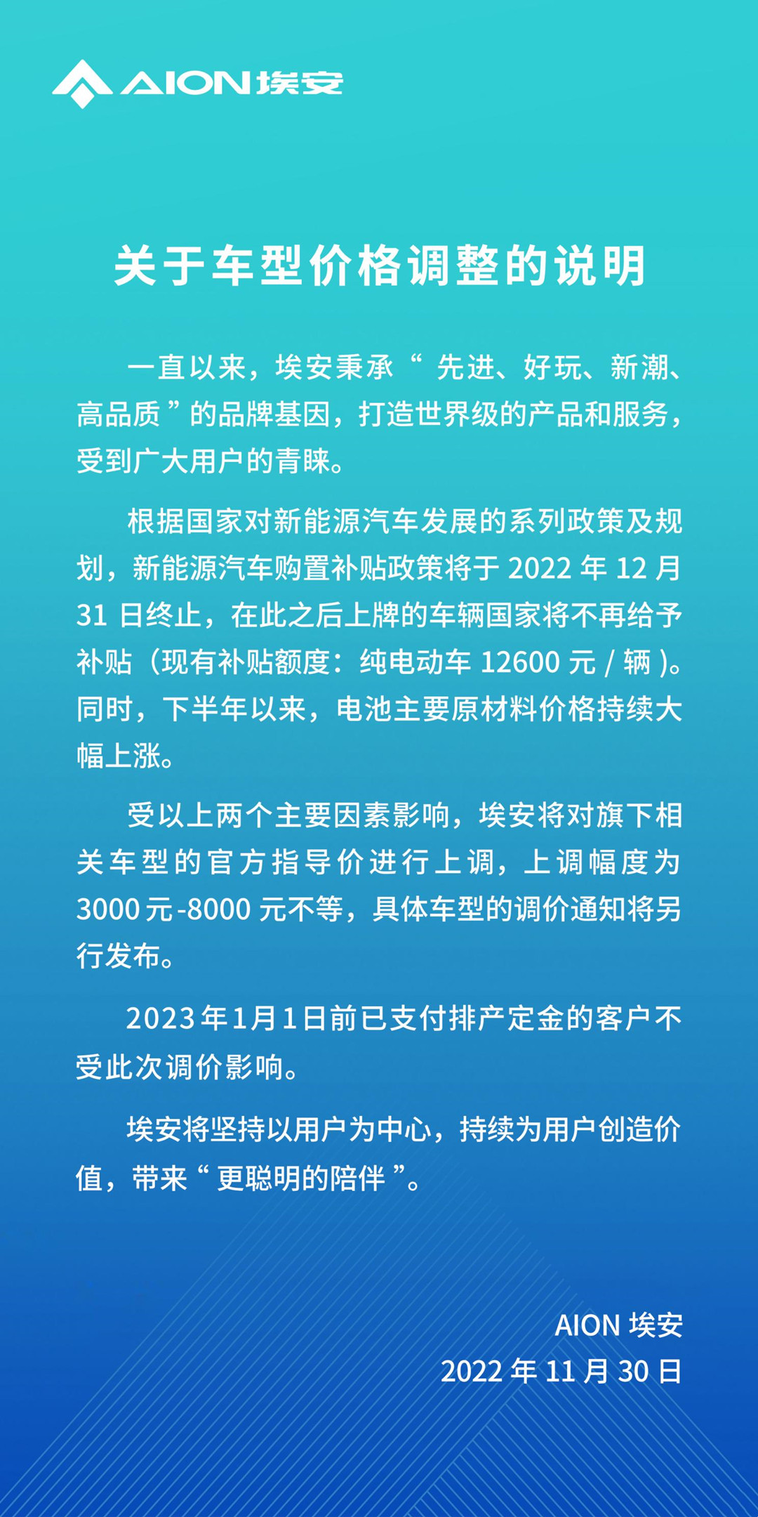在补贴终止后,新能源车市场必定会迎来几个月的“寒冬”,所以各家车企提前公布保价和涨价政策,其实也有刺激潜在用户堆在12月购买的意思。
