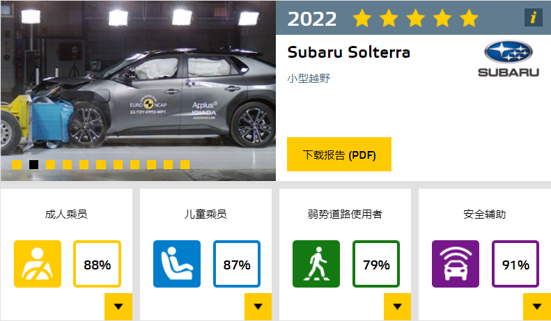 因此,就在近期的2022年E-NACAP最新一期碰撞测试成绩了解到,斯巴鲁SOLTERRA荣获五星最高安全评级!