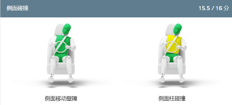 侧面碰撞的表现更加优秀,满分16分获15.5的高分。碰撞发生时车身侧面并没有过多的形变量,并且该车配备了远端安全气囊,避免车内乘员二次碰撞而引发受伤的风险。
