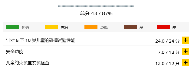 而在儿童乘员方面,针对6至10岁儿童的碰撞试验性能以及儿童约束装置安全检查均以满分的姿态通过测试。