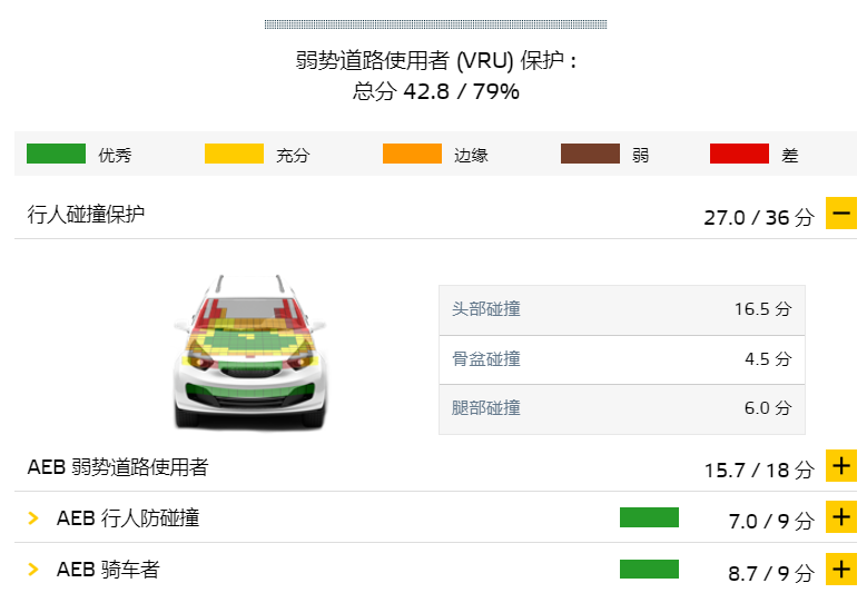 此外,对外部行人的保护方面满分36分以27分的高分通过,其中头部碰撞得分为16.5,骨盆碰撞4.5,腿部碰撞6.0。