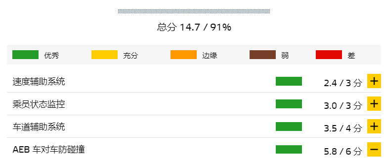 最后在安全辅助类方面,速度辅助系统、乘员状态监控、车道辅助系统以及AEB车对车防碰撞方面的得分都几乎以满分的姿态通过。