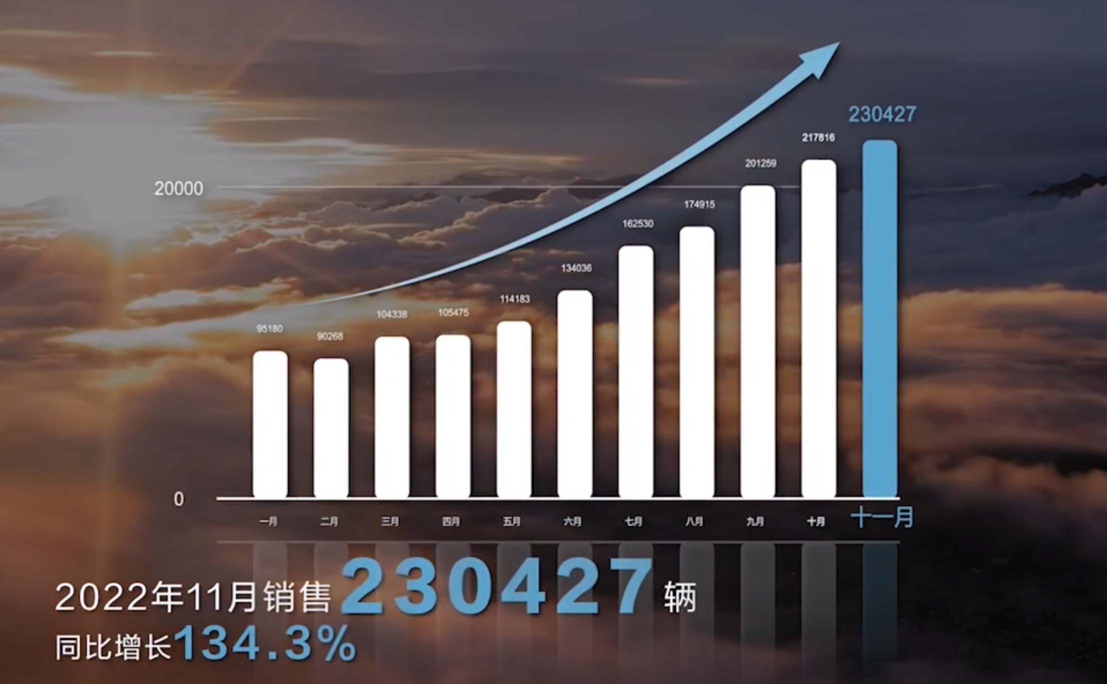 比亚迪在11月份销量达到了230427辆,同比增长134.3%,而已经是它连续三个月单月销量突破20万辆了。其中,DM车型销量为116027辆,EV车型销量为113915辆。