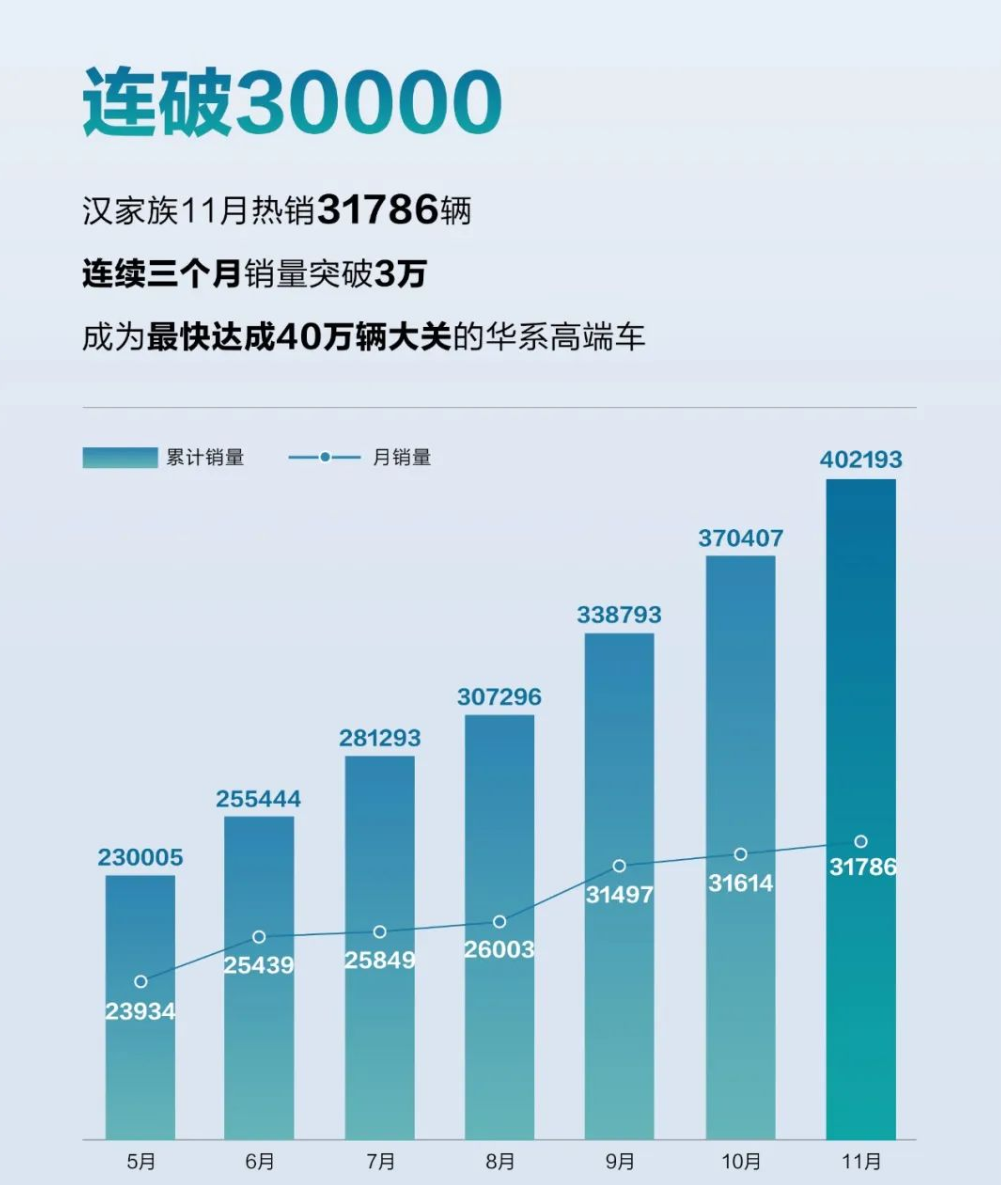 值得一提的是,汉家族的销量自从今年3月份开始就一路攀升,到11月份,汉家族已经连续3个月月销破3万。值得一提的是,它的累计销量更是突破了40万辆大关,是最快达成40万辆大关的华系高端车型。