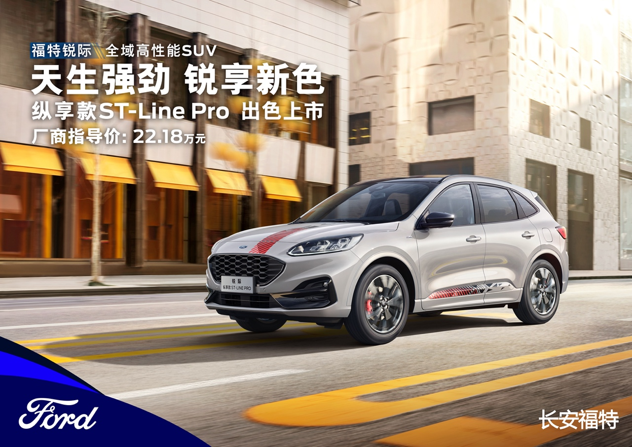 想要征服许多挑战,想要探索许多美景?没有高性能怎能行!想要出街更有型格,想要享受更带感的生活,没有时尚动感外观怎能行!作为一款更懂城市新锐中产人群的高性能SUV,福特锐际以高颜值、强性能让他们在出行生活中又潮又飒。锐际纵享款 Pro在顶配车型EcoBoost® 245四驱 纵享款 ST-Line版本上再进阶,从颜色造型到配置,内外焕新,以高价值体验“燃擎劲爆”年轻人的每一次出行!