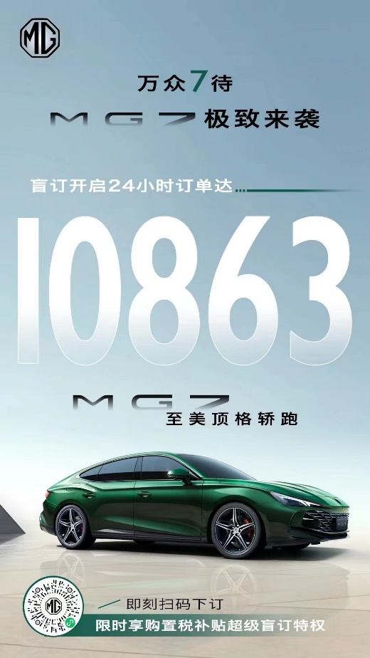 MG以不将就不妥协的匠人精神,打磨至美顶格轿跑MG7,其设计水准、供应链整合,以及以动力为代表的核心零部件等,都已达到全球领先水平。这样一款足以代表中国汽车工业顶流之作的“至美顶格轿跑”,得到了消费者的认可。为回应用户期待,MG带来充满诚意的超级订车福利,为订车用户提供国家购置税取消部分的全额现金补贴。现在起至12月31日,消费者通过上汽名爵小程序、MG Live APP等官方渠道下订即可锁定该权益,并获得优先提车权。与极致较真的MG黑标和MG7,后续还将解锁哪些极致体验,值得期待。