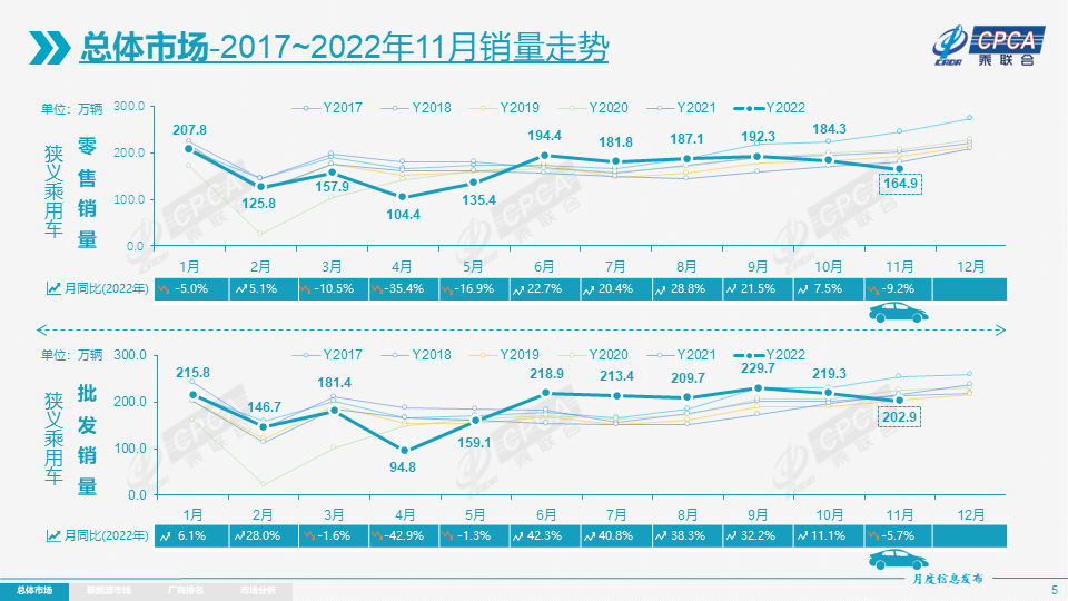 根据乘联会给出的数据显示,2022年11月乘用车市场零售达到164.9万辆,同比下降9.2%,零售环比下跌10.5%,自2008年以来首度出现“金九银十铜十一”环比下跌状况,实属罕见。
