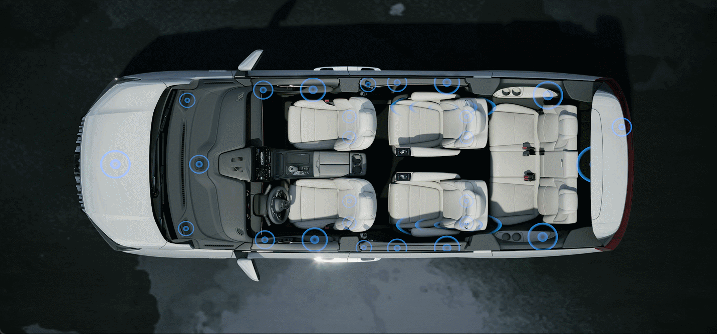 ADiGO SOUND搭载超过40个扬声器,采用7.3.2x的领先声场布局。行业首创“天际声道”,车顶双侧采用7+7扬声器阵列,结合独特的声腔设计与专属的音效调校,带来空灵、悠扬的天际声音体验。前排2个独立重低音发声单元,匹配后方低音炮,形成2+1的重低音矩阵,并采用高算力双DSP功放架构,主频最高可达4GHz,24通道总功率可达2280W。不管用户身处何处,都能体验到饱满、澎湃的重低音。