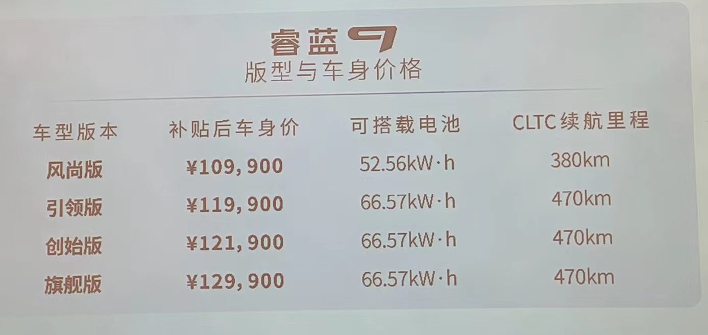 而睿蓝9则是该品牌进军家用领域的重磅车型,新车定位于中型SUV,轴距达到2825mm,并提供6座和7座可选,同时其车身售价仅需10.99-12.99万元,将中型纯电SUV的门槛拉低了10万元这个价位中。
