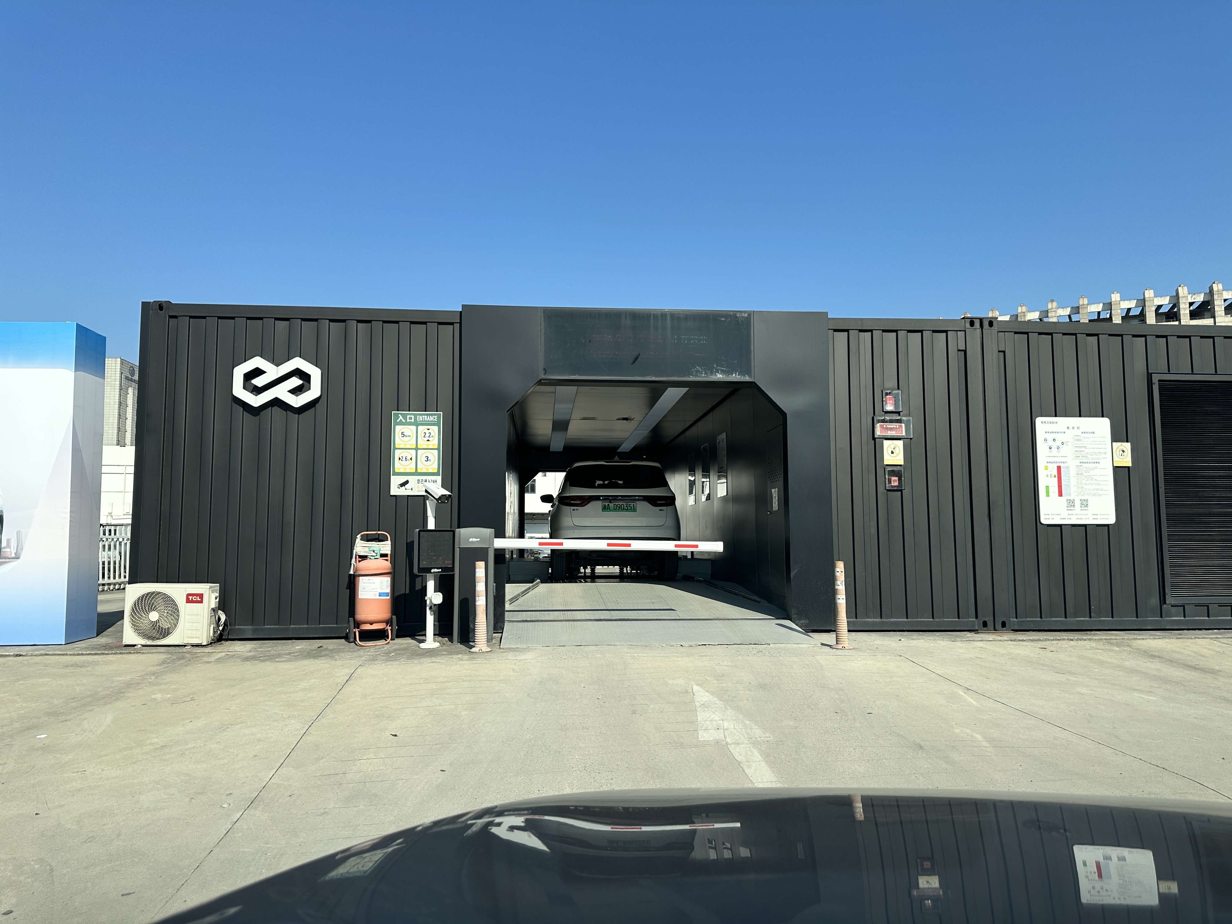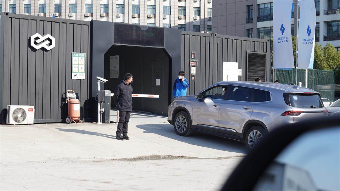 经过简单的试驾后,我们便来到换电站这边,这边已经有不少网约车在排队等待换电,而整个换电的过程非常快速便捷,先要驾驶睿蓝9进入换电区域,停到固定位置挂入N挡、松开手刹即可,期间无需断电,此时扫码付款即开始换电。