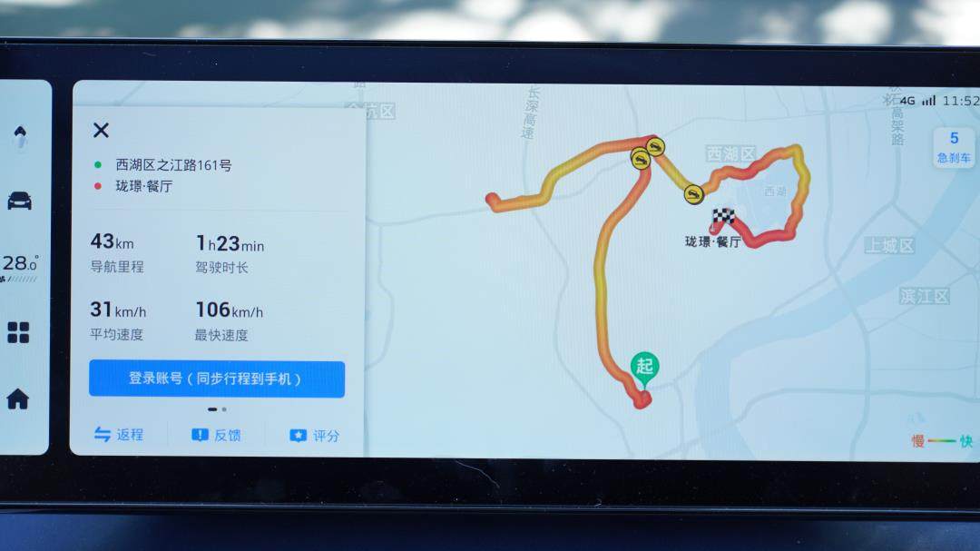在试驾开始前,教授用睿蓝9上的高德地图进行了导航,找到换电站位置,本次试驾路线虽不长,但覆盖城市道路、城市快速路、隧道及旅游景区道路等综合路况,对于车辆的动力性能、操稳性、舒适性都有的一定挑战性。