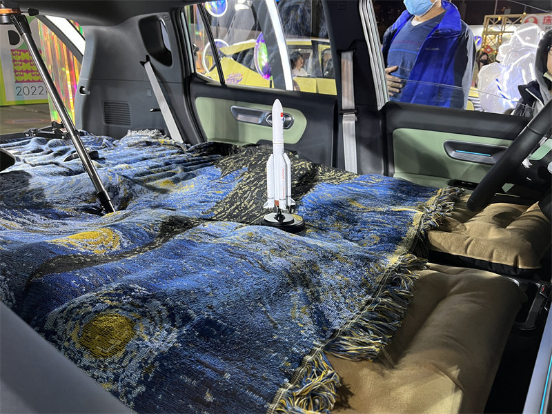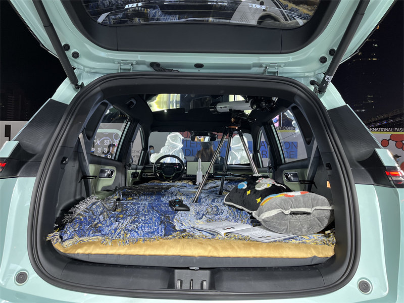 这台车非常受现场观众的喜爱!现场的展车为了展示AION Y Plus的空间,把前排座椅完全放倒了,铺上了那张巨大的充气床垫和厚毛毯,再配合上车内装饰的一些太空相关的小装饰,你还别说,整台车的车内氛围确实相当温馨,让人看了就想钻进去睡一大觉。在我站在现场拍照的大概半个钟里,无数年轻情侣在这台车打开的后备箱处停下来,无数情侣中的女方钻进这个温暖的空间里(当天现场温度有点低)各种自拍打卡。和父母们一起逛街的孩子们,更是在车里根本不想走。