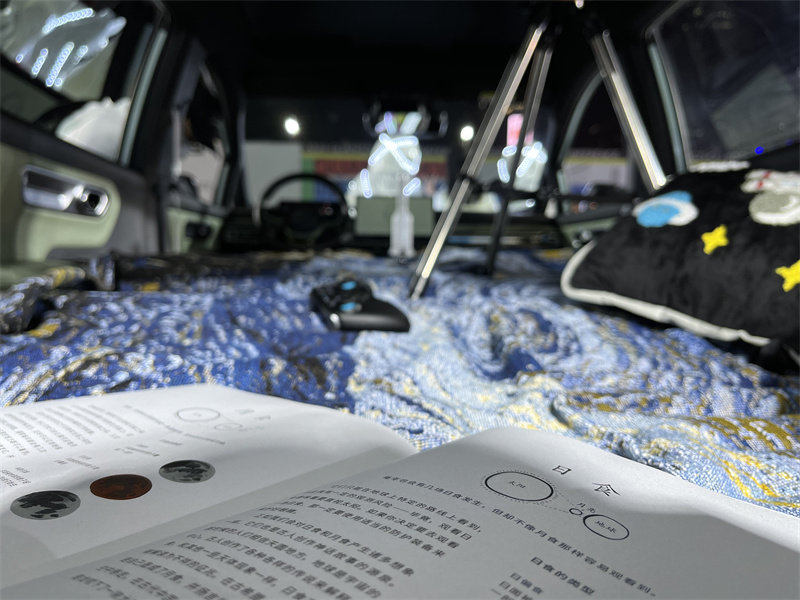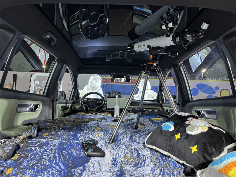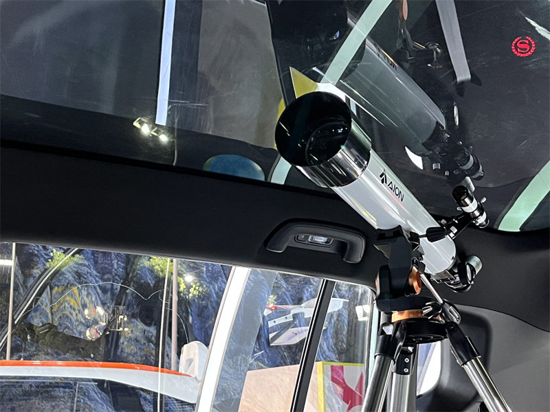 在现场发布的这款新车,名为AION Y Plus星空探索版,首先跟大家强调的是,这不是一款新车,它相对于现售的AION Y Plus相比并无任何机械或配置上的变动,价格也没变。这台车仅有的区别在于,广汽埃安为这款车搞了一套名为“星空探索组件”的东西,这套东西由一个天文望远镜、一张很舒服的、星空主题的厚毛毯、一张官方称之为“变态大”的巨型充气床垫(能覆盖整个车厢大小,的确挺大的)以及一些小部件组成。