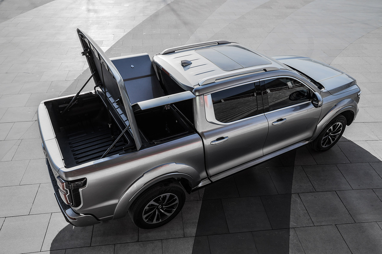 最为独到的是这台山海炮的货厢开启方式,原厂给你配备了三开雨棚,尾门除了上下开启之外,还可以实现对开,据说这是一项国内首创的专利技术,可以显著提升使用时的便利性。而且货厢内部原厂配备了可拆卸挡板,将内部空间划分成了三块,这样自驾游或者露营的时候,可以很好的对装备、物品进行分类。