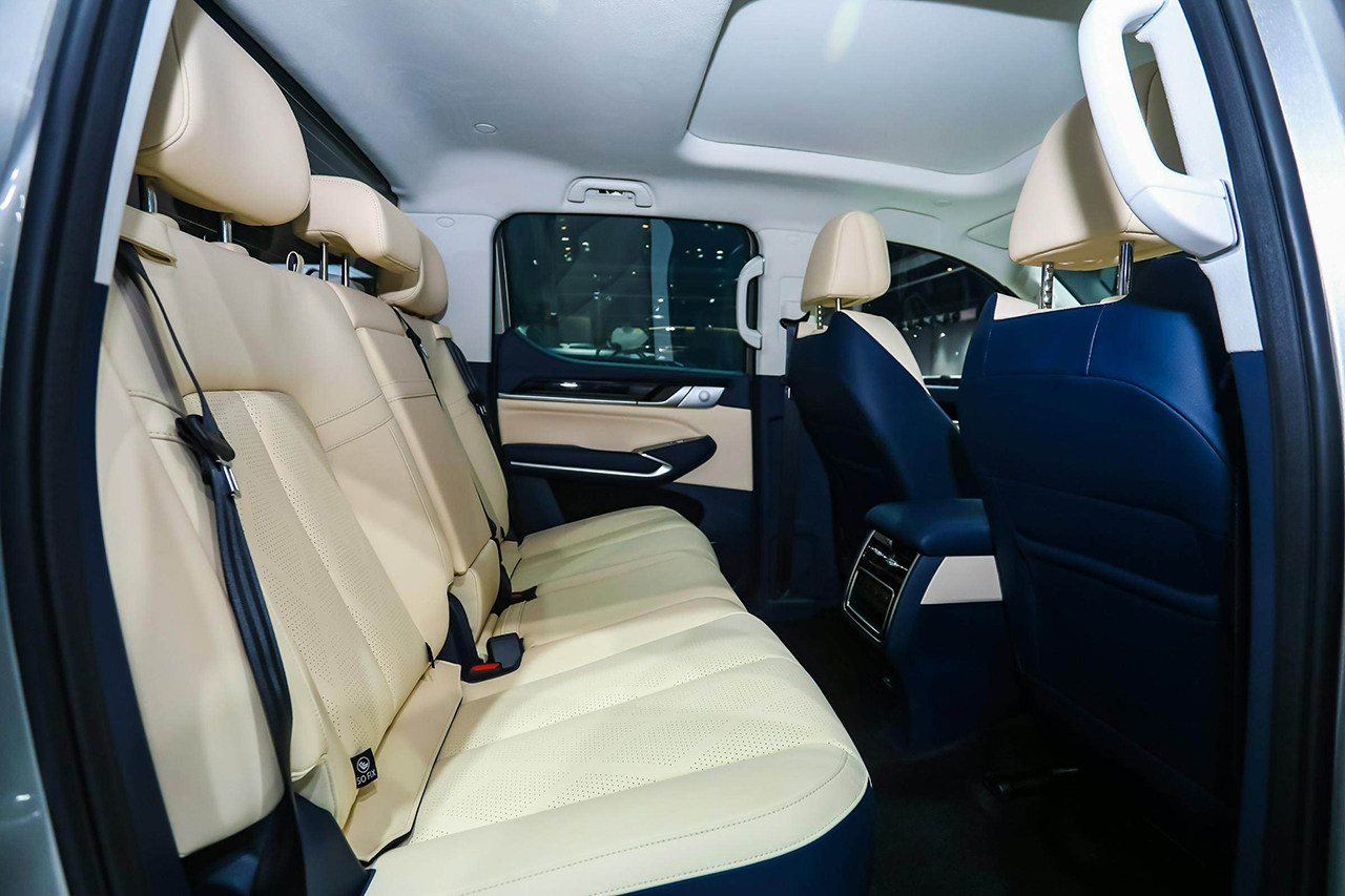 如果说内饰是吃惊,那第二排多少有点丧心病狂不讲武德。皮卡因为结构原因,第二排座椅基本都非常直立,座椅臀点也比较高,即便是F-150也是如此,但山海炮解决了这个问题,第二排给你配备了座椅靠背电动调节,还有迎宾模式,座椅填充物也足够柔软,这是编辑体验过最舒适的皮卡第二排,真的没有之一。