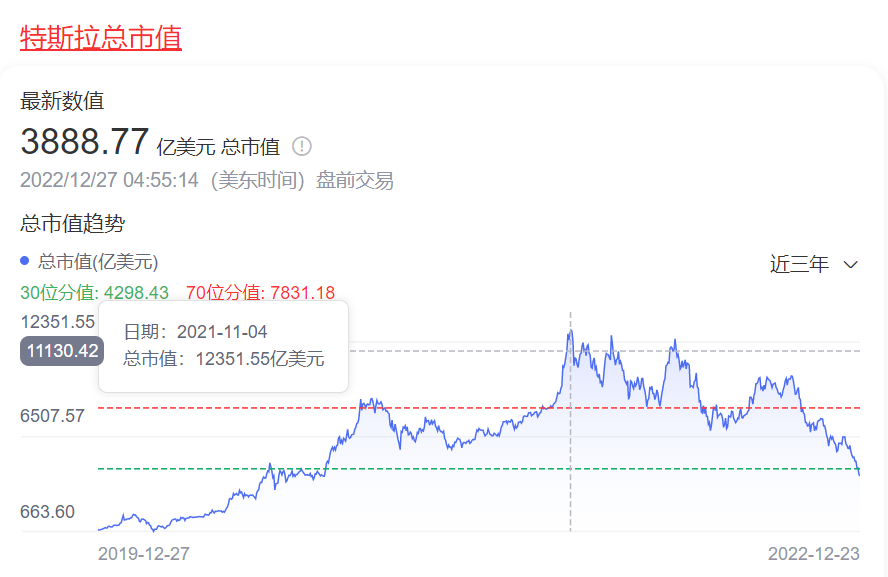 8天后的11月4日,特斯拉市值冲到了12351.55亿美元,这一刻成为了它成立以来的市值巅峰。然而,截至2022年12月27日,特斯拉市值蒸发了近70%,只剩下了3888.77亿美元,马斯克在不久之前也因此痛失世界首富。