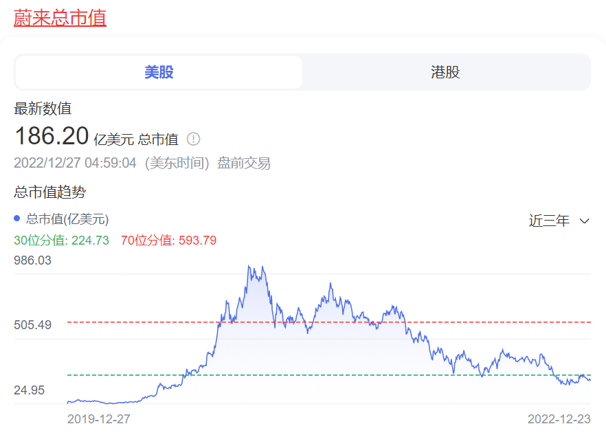 值得一提的是,在美股上市的中国造车新势力今年的市值同样也没好到哪里去。其中,曾经无限接近千亿美元的蔚来市值只剩下了191.63亿美元,理想也从今年6月份的421.3亿美元下跌到了195.64亿美元,小鹏汽车更是只剩下了86.79亿美元。