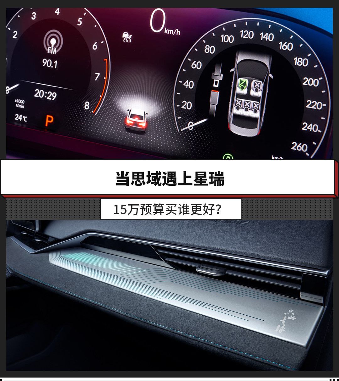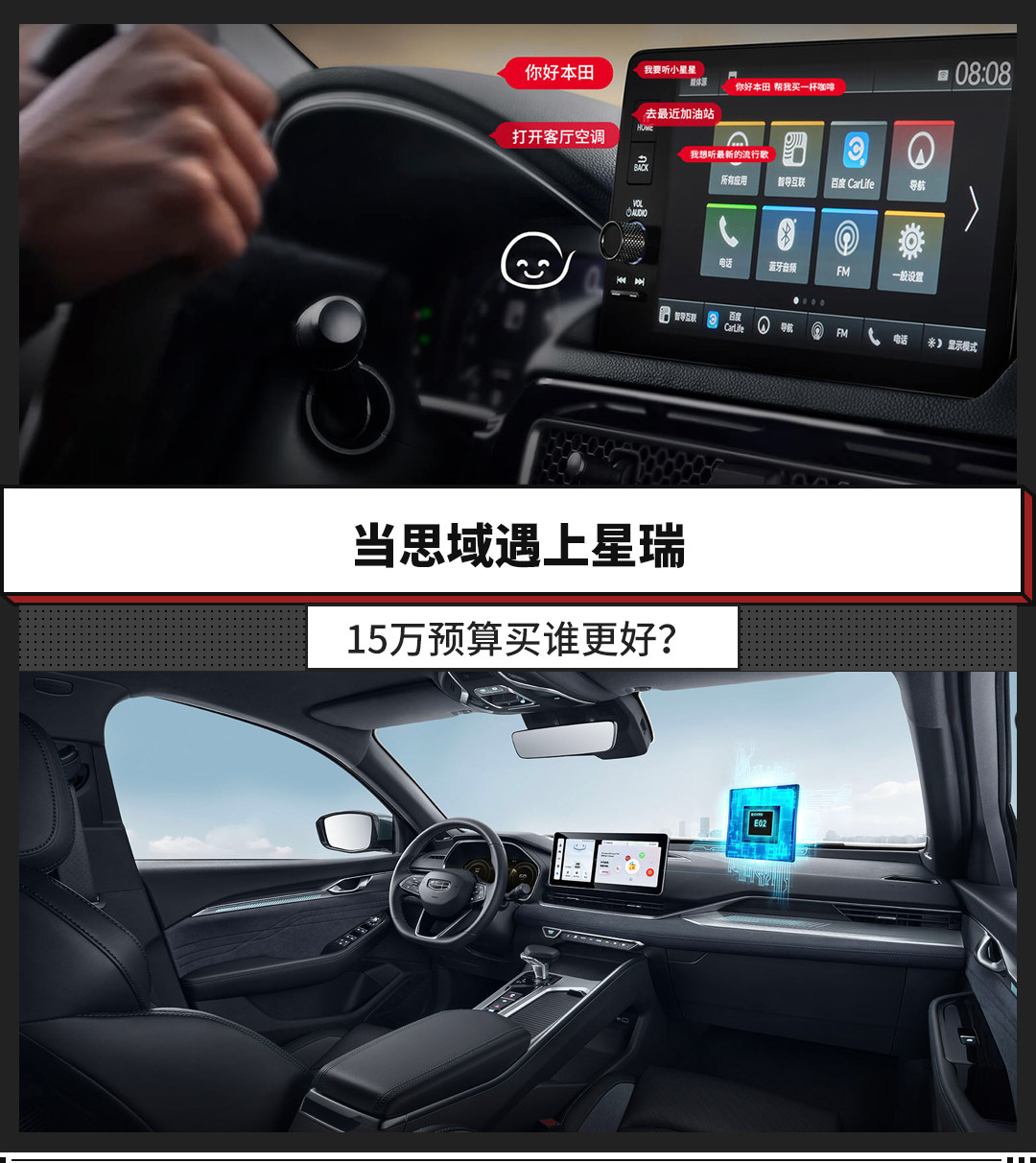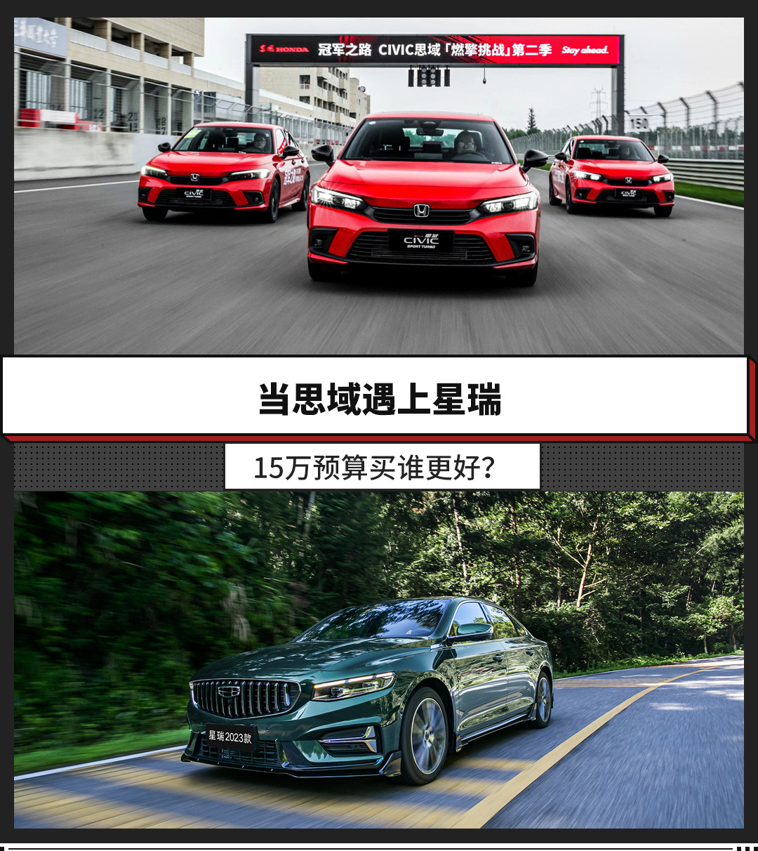 星瑞在2020年11月上市,至今还不足三年,不过凭借“超大杯”家轿属性,以及科技和中国传统文化的融合,塑造了时尚典雅的中国家轿新风尚,同样吸引了众多年轻消费者的关注。回到我们今天的选车条件,如果是预算15万的话,可以选择思域 2022款 240TURBO CVT燃动版(指导售价14.99万元),以及星瑞 2023款 2.0TD 只此青绿版(指导售价14.57万元)。两车售价接近,接下来,我们就来看看这两款车各自表现如何?