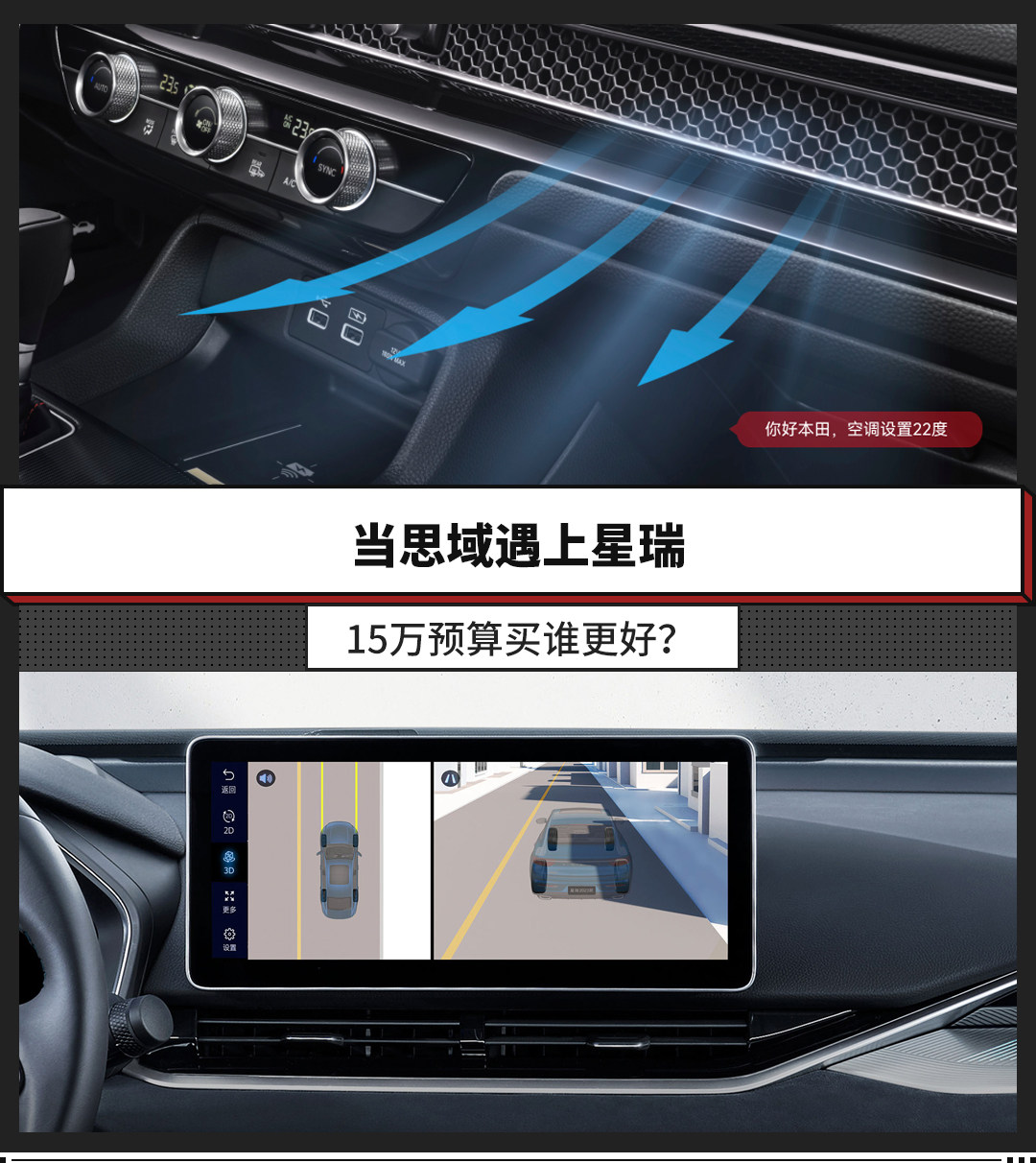 配置方面,思域前排双温区空调系统独立于车机,采用实体键控制,调节旋纽质感很好,旋钮屏巧妙融合了风量显示,具备PM2.5过滤装置。星瑞只此青绿版前排双温区空调可通过屏幕或下方实体键控制,带AQS空气质量管理系统、PM2.5过滤装置和香氛系统。亮点配置方面,思域配备了可变转向比、车载ETC、LED车前雾灯等,而星瑞只此青绿版则拥有可开启全景天窗、无级变色氛围灯、10扬声器BOSE音响车内化妆镜照明灯、感应雨刷等。