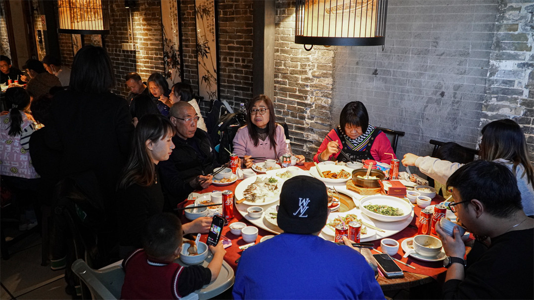 一家人都看得津津有味,对师傅们扎实的基本功和高超的技艺表示敬佩,纷纷拍手叫绝。