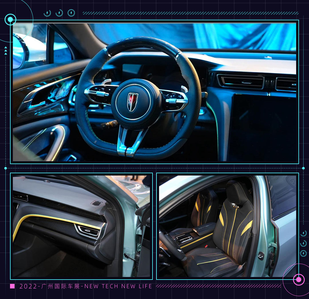 红旗H6的内饰设计同样非常有运动感。从现场展车可见,内饰的主色调为黑色,大面积采用了翻毛皮等凸显运动特质的材料,同时点缀以黄色线条。无论是内饰材料的选材还是配色,都很有战斗风。而内饰部分比较让我们印象深刻的,还是它方向盘区域传递出来的质感。在特定的光照下,H6的方向盘--仪表板位置非常有质感,特别是方向盘的材料搭配,真皮+翻毛皮+碳纤维三种材料的混合,加上方向盘自身的金属材质。给人最直观的感受就是,这是一台在保证了质感的同时,还兼顾了运动型表达的新车。