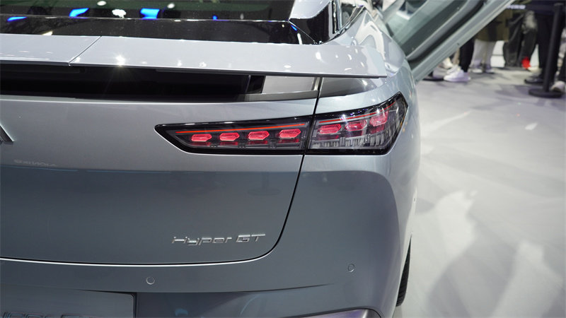 尽管它的名字既有Hyper这样的,标示以“极致”的词汇,又有“GT”这样的和超跑挂钩的词,但这台车其实本质上还是一款运动型轿车。在外观上,Hyper GT最吸引人关注的有两个点:鸥翼门和伸缩式升降尾翼。Hyper GT的前门采用鸥翼门设计,你要说这种设计有啥工程学或者实际使用上的优势吧?它不见得比传统的横向开门式的车门有多少好处,但帅,是真的帅。如果你曾经被小鹏P7鹏翼版开门的那一下惊艳到的话,相信我,Hyper GT开门的动作给人带来的视觉冲击,绝对不亚于当年的P7鹏翼版。