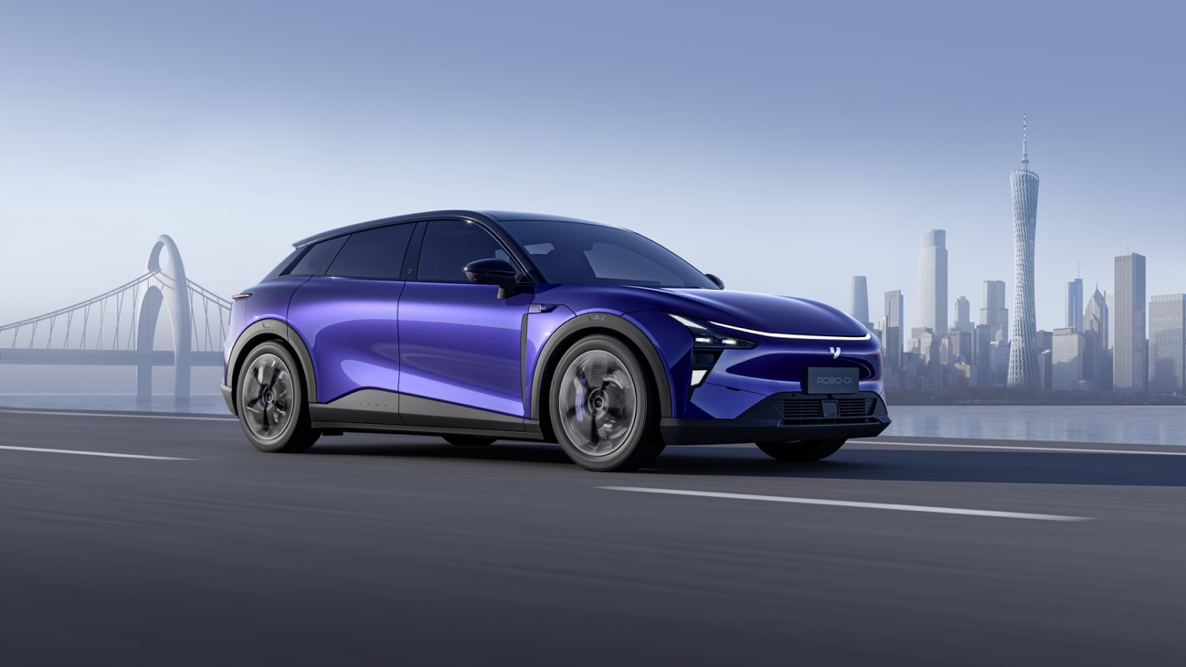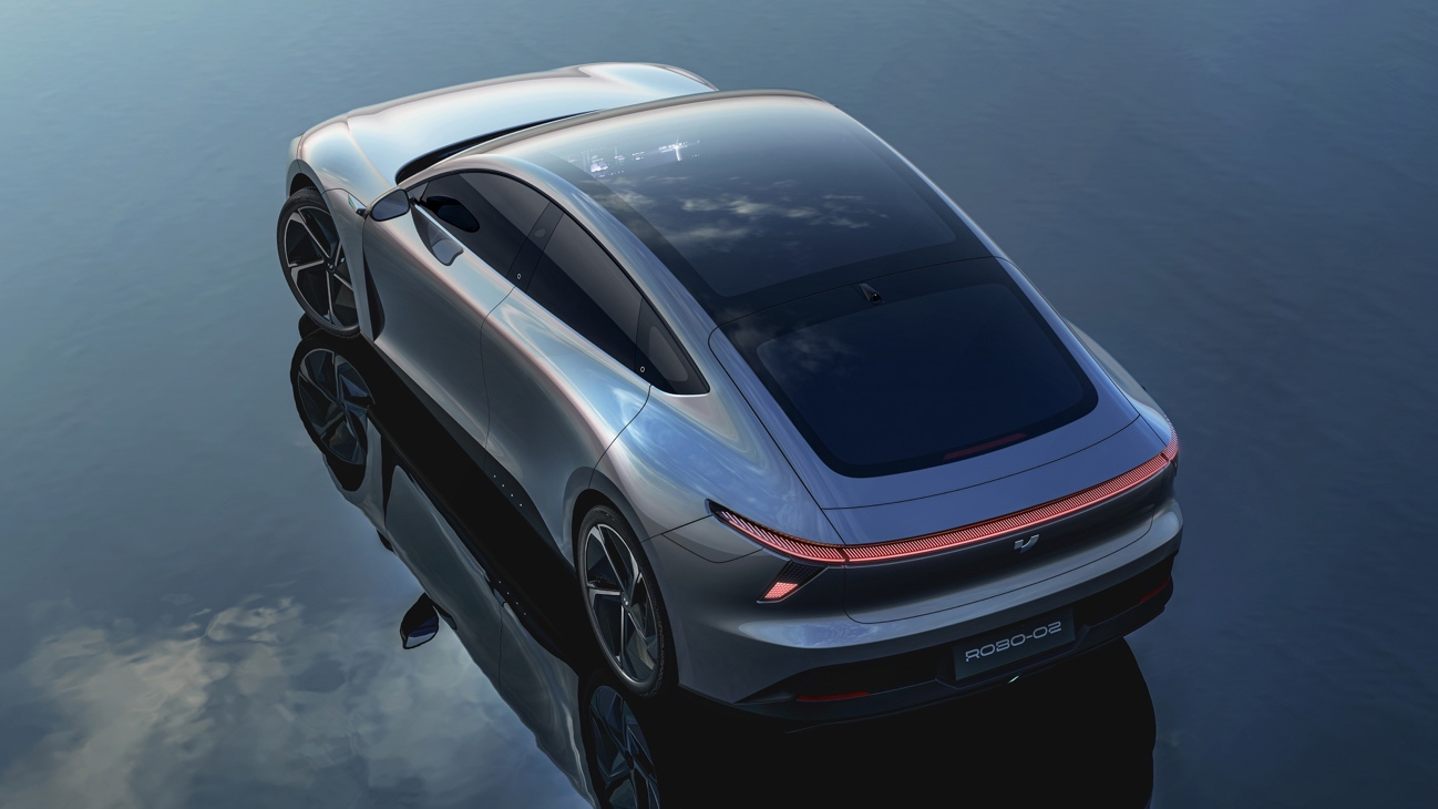 ROBO-02采用超运动型未来主义机器人化外观设计,无车外门把手让科技与颜值双料在线,拥有极致动感的整车比例和超性感的车身曲面。搭载业内集成度最高的智能大灯,灯内集成交互式AI像素灯、远近光/转向/日行/位置灯,以及隐藏式激光雷达。空气动力学轮毂和主动升降式尾翼进一步提升了整车空气动力学性能,打造业内领先的超低风阻系数。