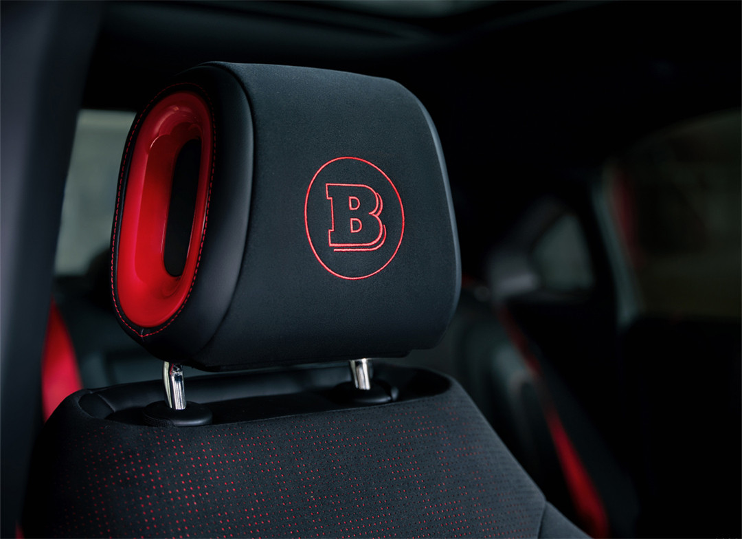 精灵#3 BRABUS版本在方向盘、座椅等地方同样会采用翻毛皮材质和红色缝线,且头枕印有BRABUS印花和多处带有徽章。