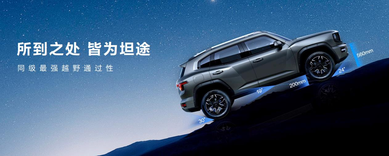 日常使用足够高效,在两天业余时间的郊野寻趣场景下哈弗H-DOG的全路况通过性同样可以惊艳到你。它的车身接近角24°、离去角30°,纵向通过角19°,最小离地间隙200mm,拥有560mm同级最高涉水深度,所到之处,皆为坦途。