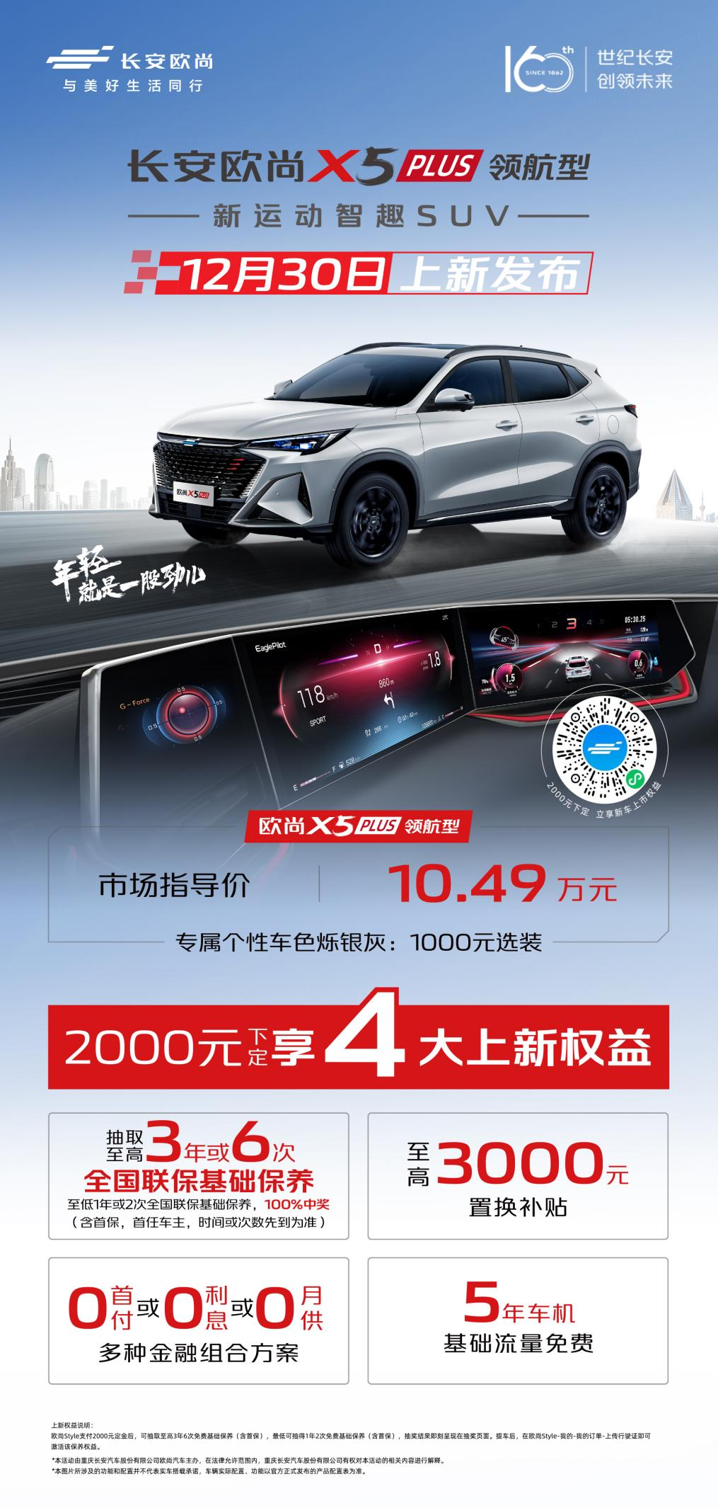 12月30日,“新运动智趣SUV”全新车型——欧尚X5 PLUS领航型上市发布,新车上市指导价10.49万元。伴随着欧尚X5 PLUS领航型的上市,官方同步也推出了购车福利,当前下定欧尚X5 PLUS,可享4大上新权益,包括:抽取至高3年或6次全国联保基础保养,至低1年或2次全国联保基础保养,100%中奖(含首保,首任车主,时间或次数先到为准);至高3000元置换补贴;0首付或0利息或0月供多种金融组合方案;5年车机基础流量免费等,让年轻人轻松入手,用车无忧。
