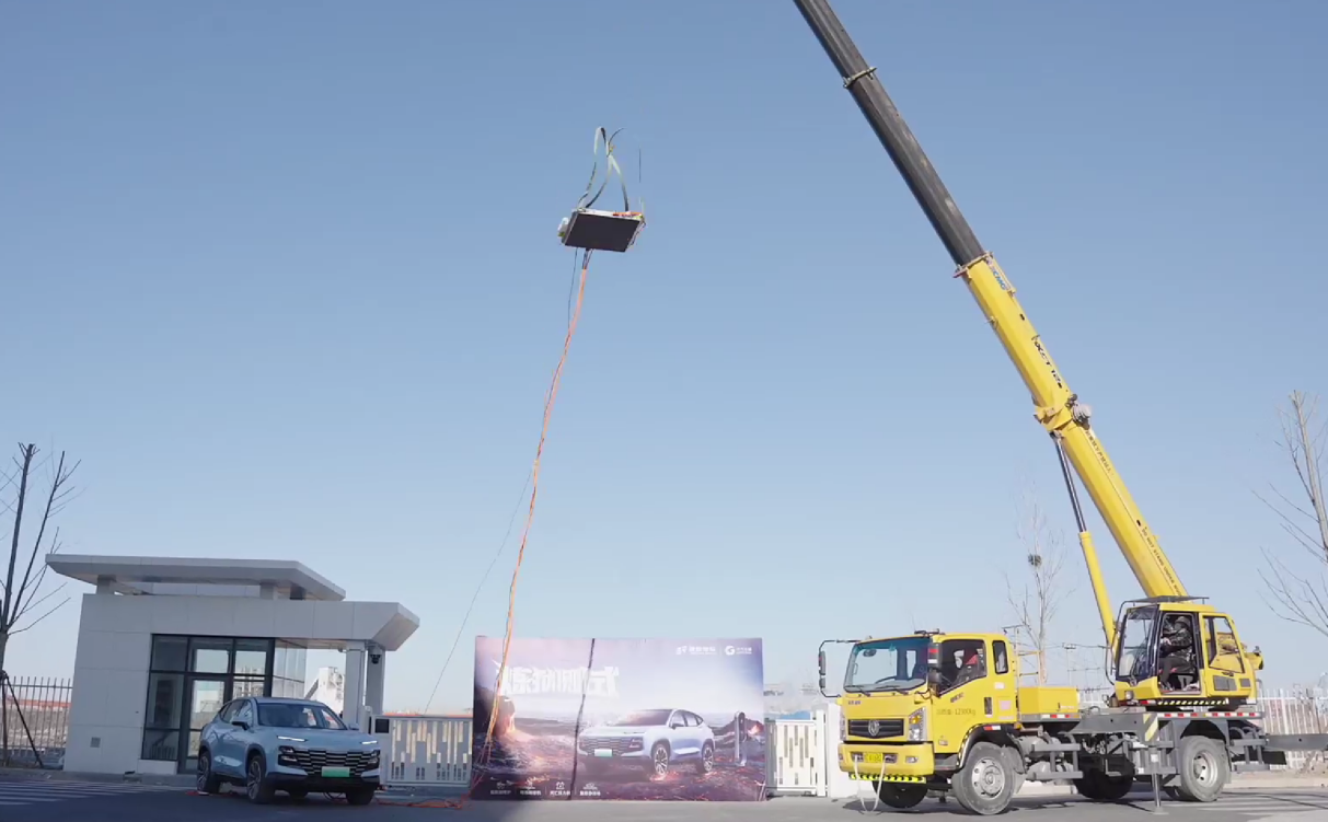再来看看电池跌落试验有多“卷”?这次就让捷途大圣i-DM的电池包坐一次“跳楼机”,从10米高度自由落体,相当于以50km/h的速度直击地面,其难度为国家1米标准的10倍!该试验其实是为了模拟车辆在快速行驶时底盘托底受到猛烈撞击,观察整个过程,不难发现电池整包结构并无重大损伤,未发生电解液泄漏、起火甚至爆炸等情况,说明电池表征受到强力冲击下安全性能依然稳固,这种安全水准在行业内也是遥遥领先的。