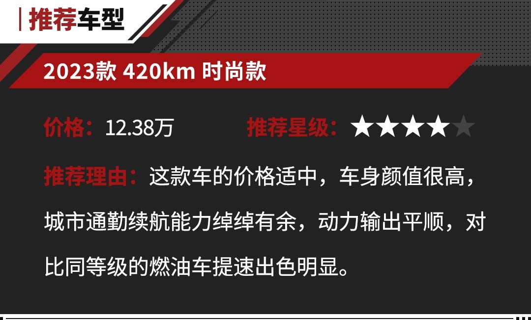 配置推荐,最为推荐的是海豚的2023款420km时尚款,这一款是海豚续航最好,几乎“满配“的一款车型。在自由版的基础上,增加了前雷达、标准/舒适驾驶模式、副驾驶电动调节座椅、前排座椅加热、后排比例倒放、后排中央扶手+杯架、内置行车记录仪、四门车窗一键升降+防夹、外后视镜电动折叠+锁车自动折叠、前排无线充电等配置,对于7000元的价格涨幅来说,还算是物超所值。