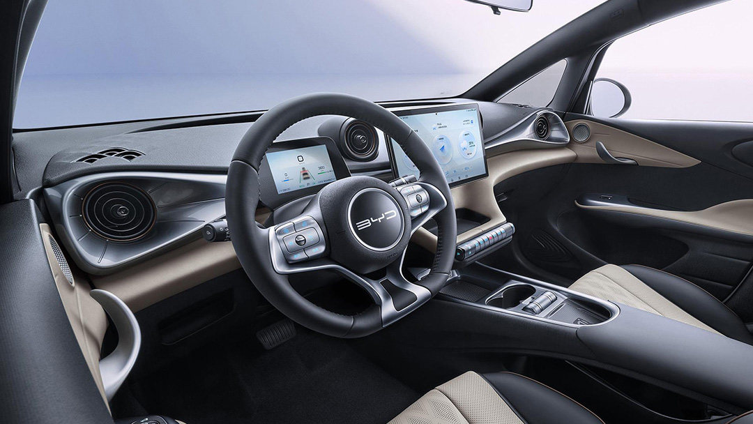 内饰方面,简化的挡位,第一眼看上去就非常的顺眼,看它的时尚中控台和一些触摸屏的分辨率就能感受都科技感。搭载三幅式的多功能方向盘、5英寸的悬浮式全液晶仪表和12.8英寸大屏,可以根据APP的不同自动旋转,也可以手动旋转,大屏搭载了智能系统,用起来和平板几乎一样,还可以分屏操作,左边是导航,右边是娱乐画面互不干扰。在中控台和车门位置使用了流线型设计,空调的出风口使用圆筒式的设计,在空调的出风口上有几多小浪花设计十分细节,圆润与流线的设计相得益彰,就像海豚在海上航行模样,运动与科技相结合,科技感强烈。在材质方面,海豚采用了大面积的软质材料进行包裹,再搭配上镀铬饰件装饰,看起来十分的精致。