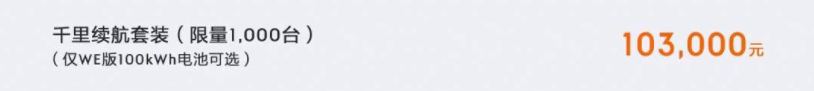 为了满足对续航里程有更高要求的用户,WE版100kWh还可进行选装1000套千里续航套装,该套装在用料方面可谓是下足功夫,其采用了CTP3.0麒麟电池和后电机含碳化硅技术,经过多方面升级过后,可实现长续航的同时还带来较高的效率,真正做到一次满足您两个愿望。