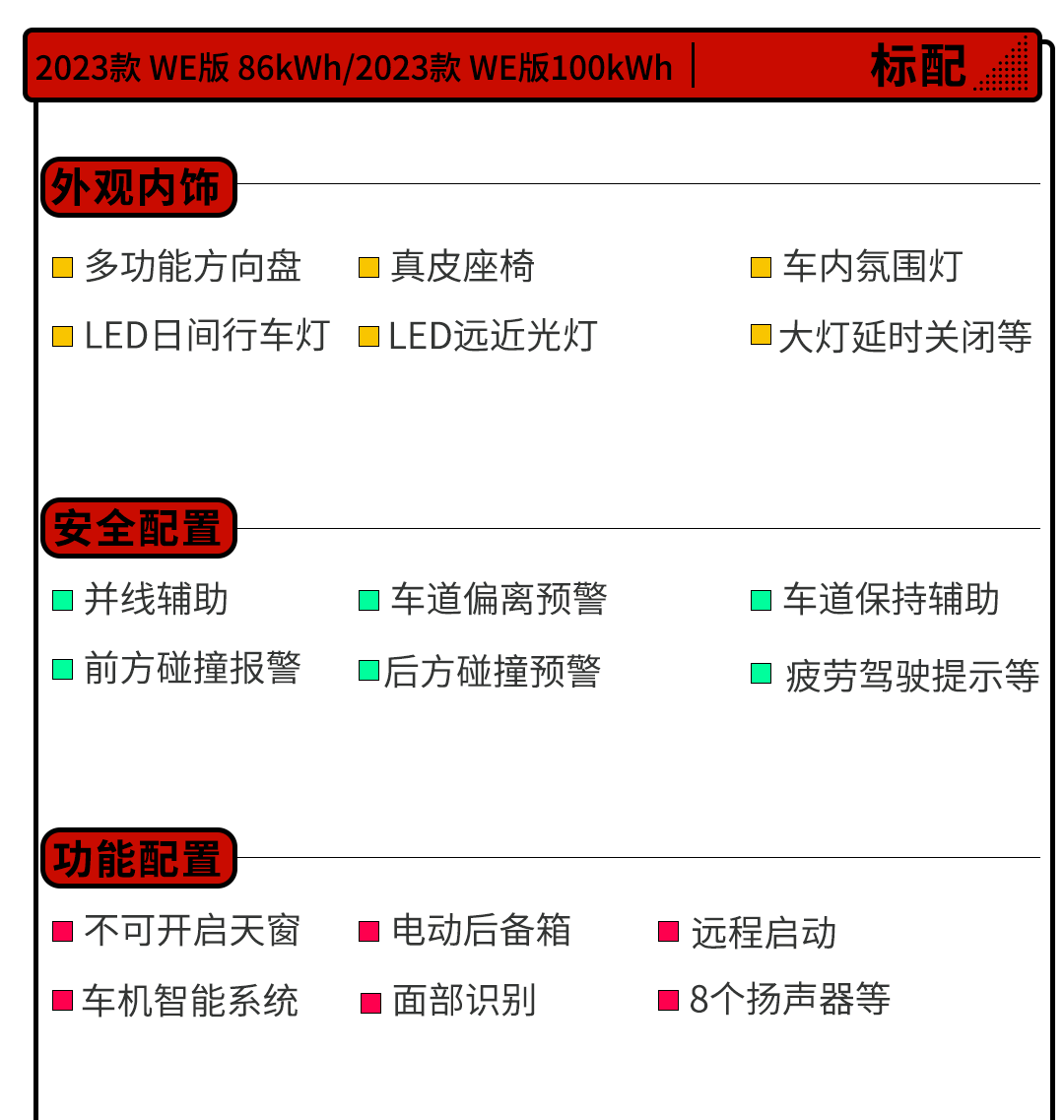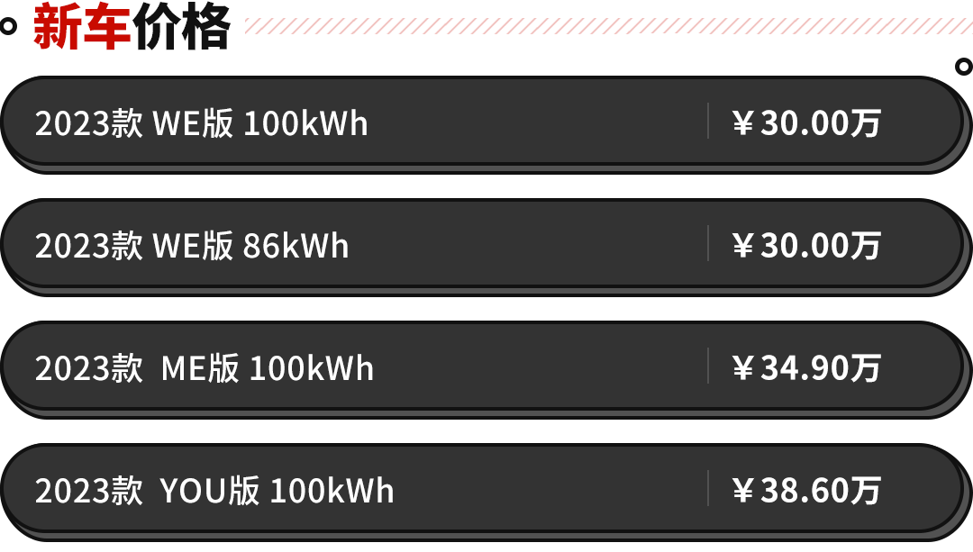 综合来看,WE版86kWh/WE版 100kWh就已经足以满足大家日常使用需求,比较在乎性价比的直接选它们准没错。若然您在乎豪华配置的话,那么ME版 100kWh版无疑是个最佳选择。