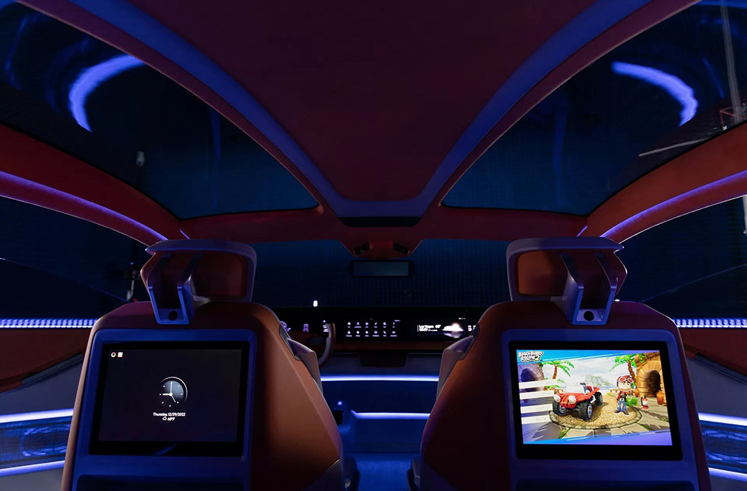 在前排,驾驶者和乘客可以通过55英寸的大连屏获取驾驶信息、控制驾驶辅助系统、享受影音娱乐和在线资讯等服务,并且支持脸部识别、生物识别、语音识别控制等功能,与当前的主流智能座舱差不多。