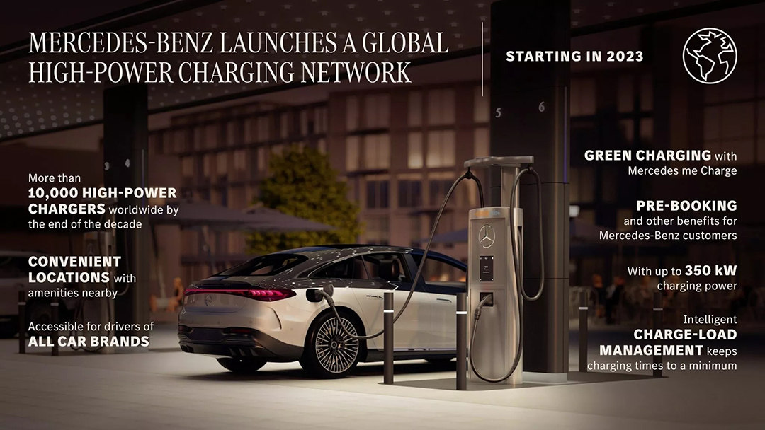 奔驰在2023年CES展上宣布,他们将会在全球范围内启动高功率充电网络建设,预计将在北美、欧洲、中国等区域建设超过10000座充电站,且均为功率达到350kW的快充站。