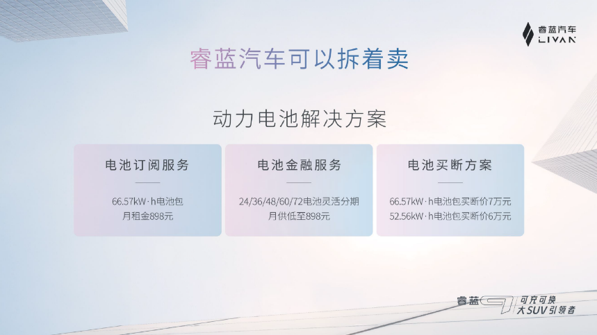 睿蓝9新车共推出4款车型版本, 车身补贴后售价区间为10.99-12.99万元,可搭载52.56kw·h-66.57kw·h电池,CLTC续航里程380km-470km。针对睿蓝9,睿蓝还开创性地提出了“汽车可以拆着卖”的购车方案。针对大众特别关注的动力电池问题,可提供电池订阅服务、电池金融服务和电池买断服务三种解决方案。用户可根据自身用车需求灵活选择适宜的动力电池使用方案。