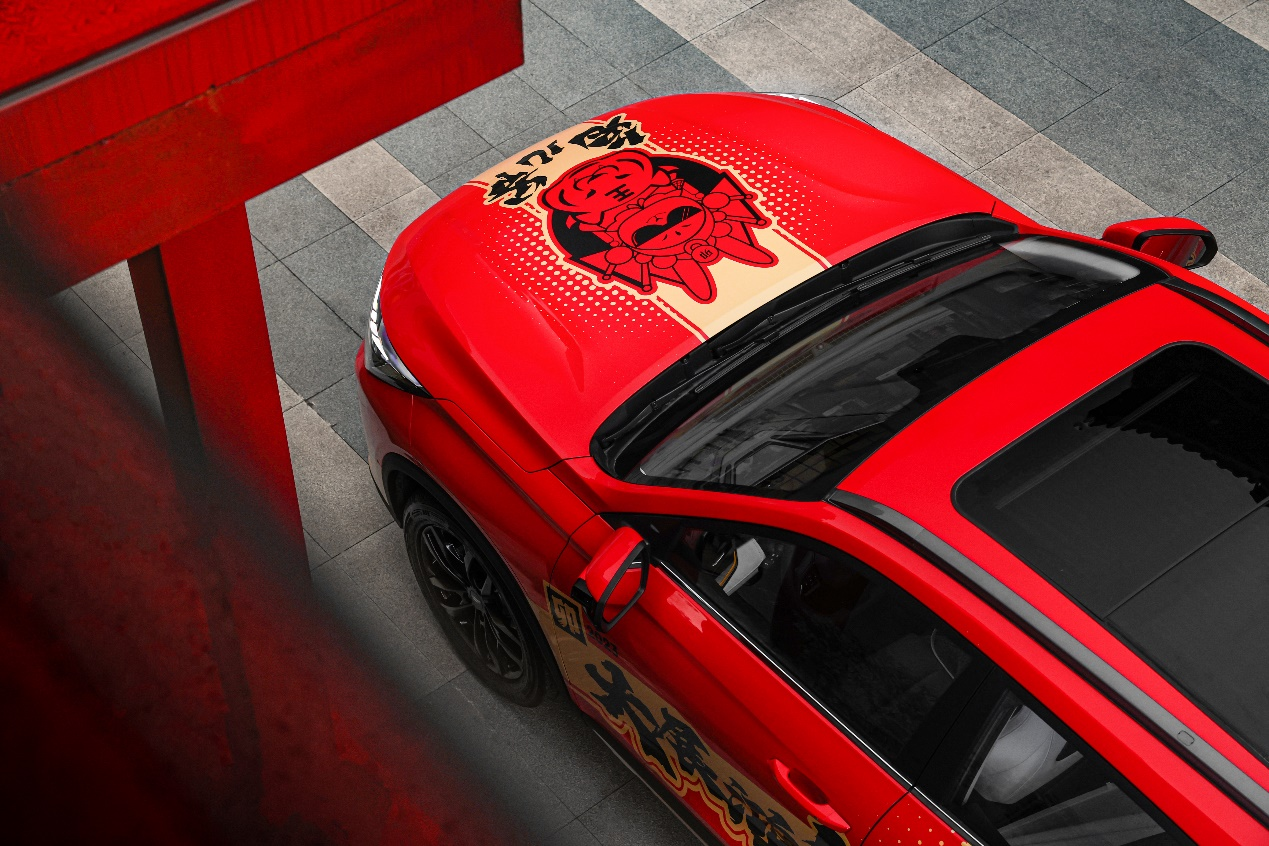 这一次的鸿兔版限定车衣,依然延续了欧尚X5系列车衣的高水准和年轻个性风格,同时也结合了兔年新春的美好寓意,进行了诸多亮点设计。整个车身采用跃动红作为主色调,呼应新春红火的过年氛围。更为特别的是,鸿兔IP形象以国潮文化“北京兔儿爷”为设计原型,并结合京剧文化、国潮文化进行融合设计。活泼、阳光,并自带神秘感、力量感的独特造型,既增添了节日的喜庆气氛,更传递出对国潮文化的自信感和热爱成光的生活态度。
