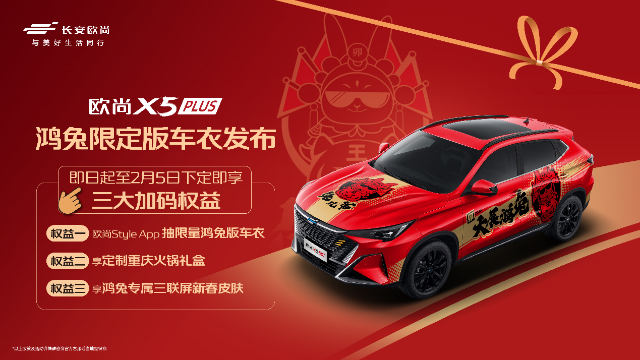 而就在昨天,欧尚汽车又点燃了第三把火。在农历兔年即将来临之际,联动TMD潮牌车膜,带来一份特别的新年礼物:欧尚X5 PLUS鸿兔限定版车衣。