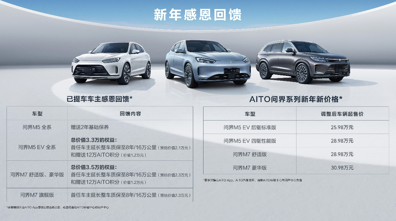此外,自2023年1月13日8点30分开始,AITO问界将带来新年新价格,问界M5 EV调整后售价为25.98万元起,问界M7调整后售价为28.98万元起。