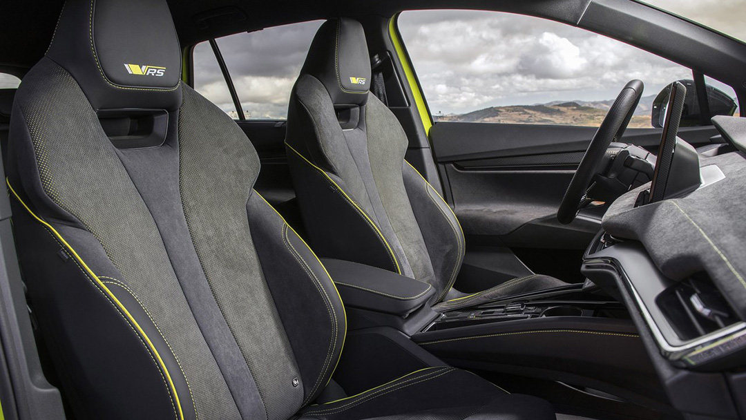 座椅部分,前排为一体式运动座椅,还带有绿色缝线装饰以及撞色设计,样式很是运动,符合车型定位。