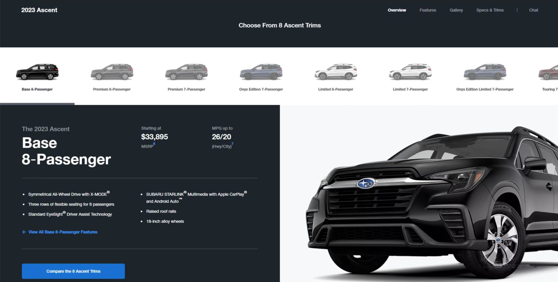 Ascent分为了基础版、高配版、Onyx版、限量版、旅行版共8种车型,提供7座和8座布局,外观有8种车漆颜色可选,内饰则有7种颜色面料搭配。