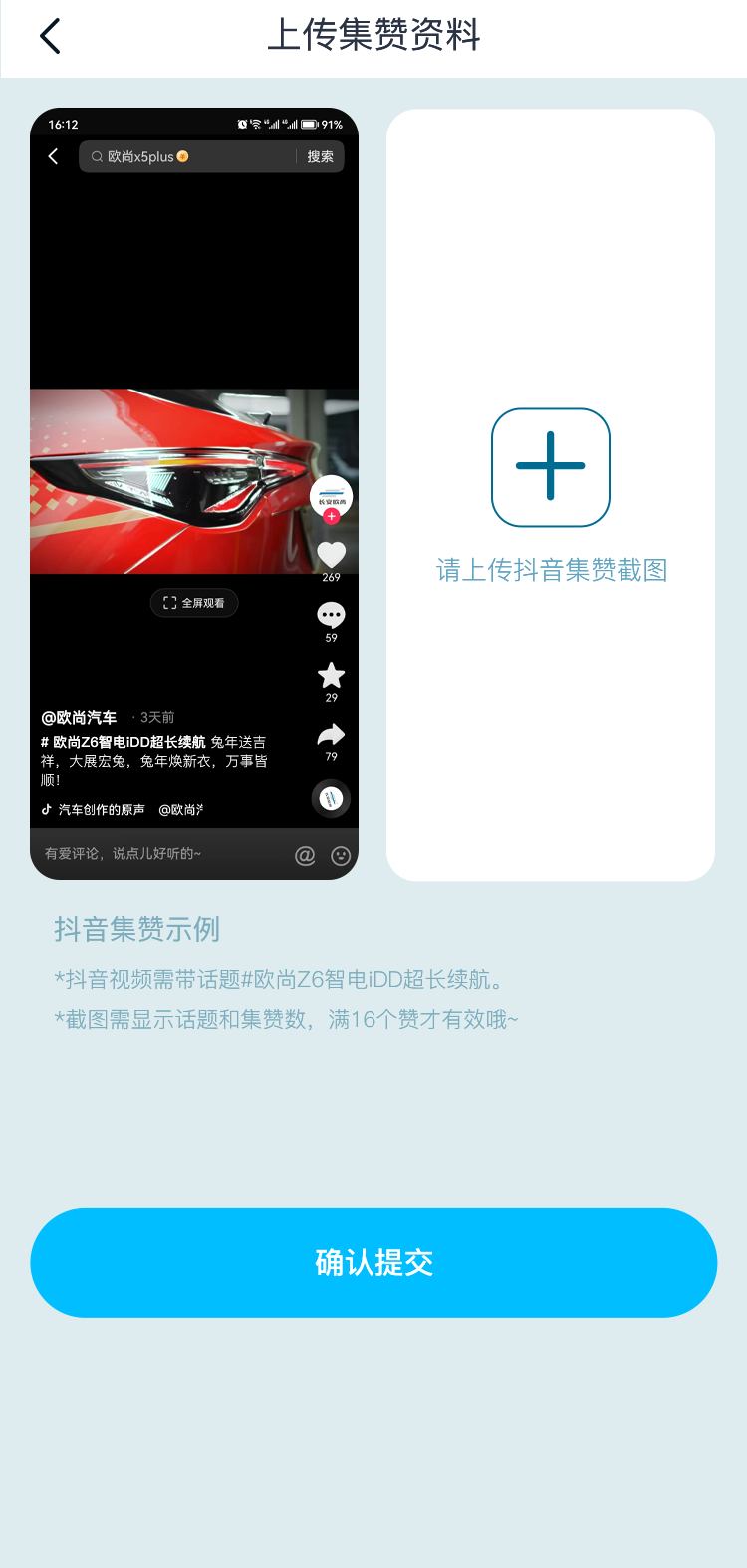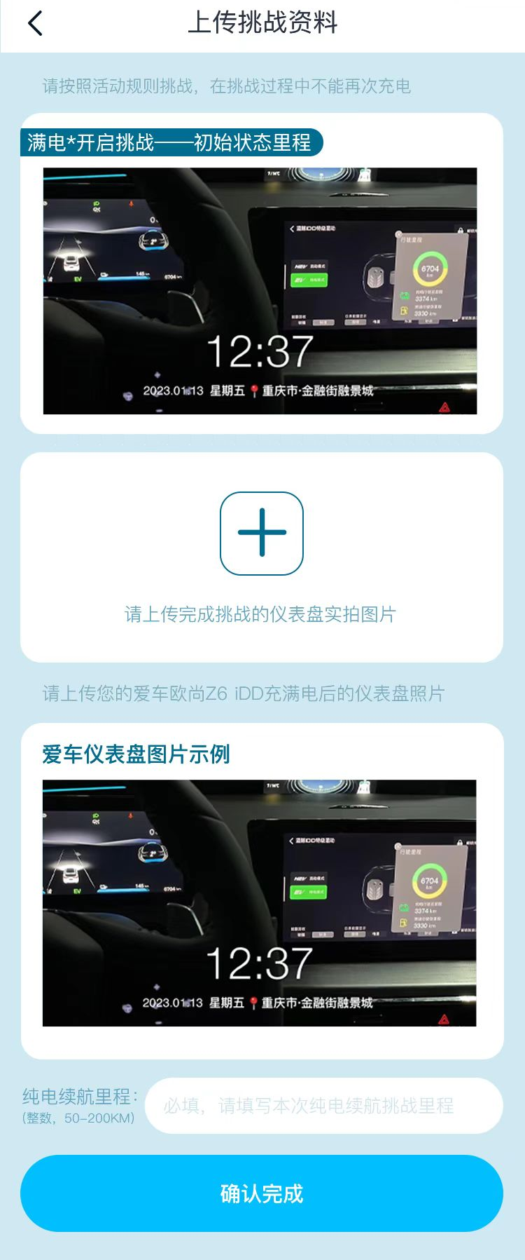 挑战流程也非常简单:开始比赛前,用户拍摄含【拍摄日期、里程数据】的仪表盘照片后,即可自行开始比赛;完成比赛后,再次拍摄含【拍摄日期、里程数据】的仪表盘照片;将两张仪表盘+中控照片上传至欧尚Style指定页面,并手动填写行驶里程数,即可完成比赛。