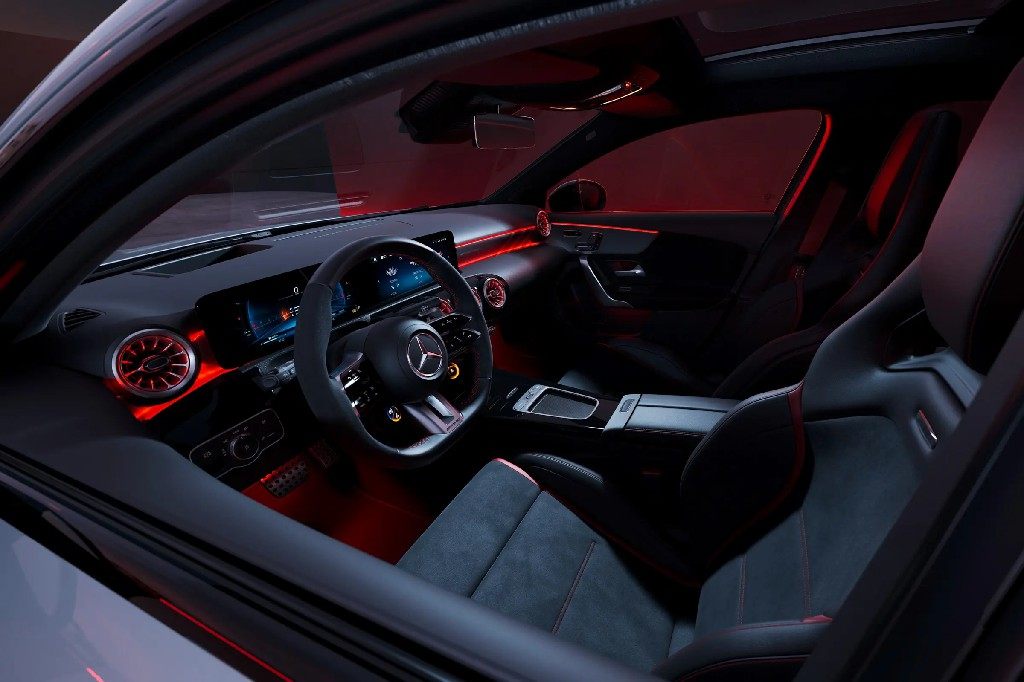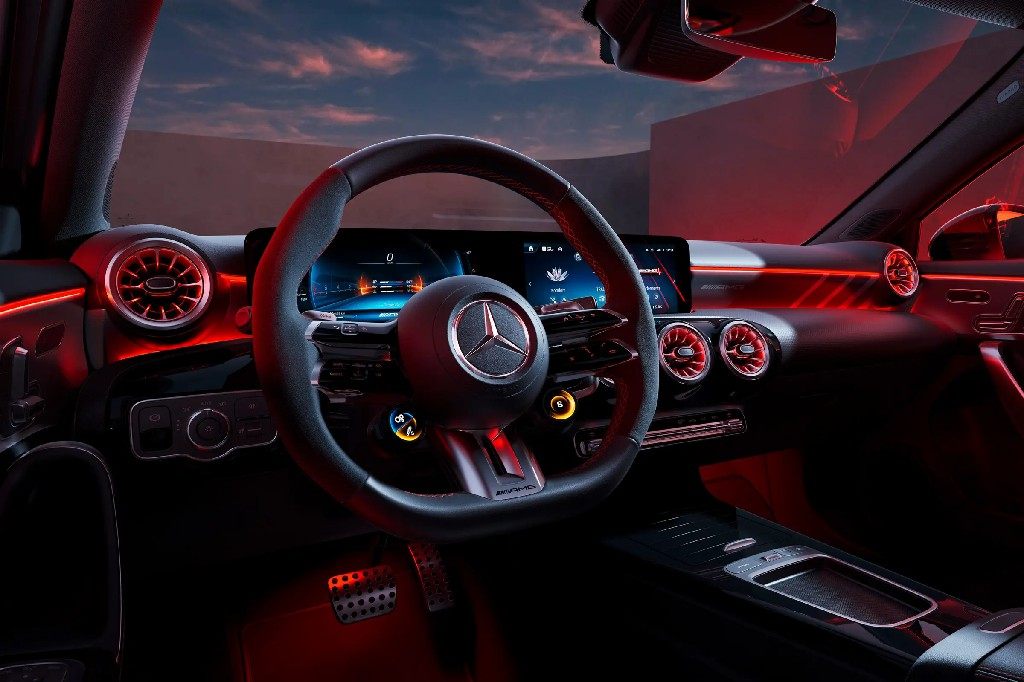 新车在内饰方面同样具备不少专属配置,但整体的设计布局依旧维持现款车型的模样。新车型仍搭载全液晶仪表和中控大屏组成的双联屏以及MBUX智能人机交互系统等标准配置。原本就配备的三幅式运动多功能方向盘、炮筒式空调出风口、扁平化电子换挡杆以及各种碳纤维装饰件均透露着豪华氛围以及运动感。