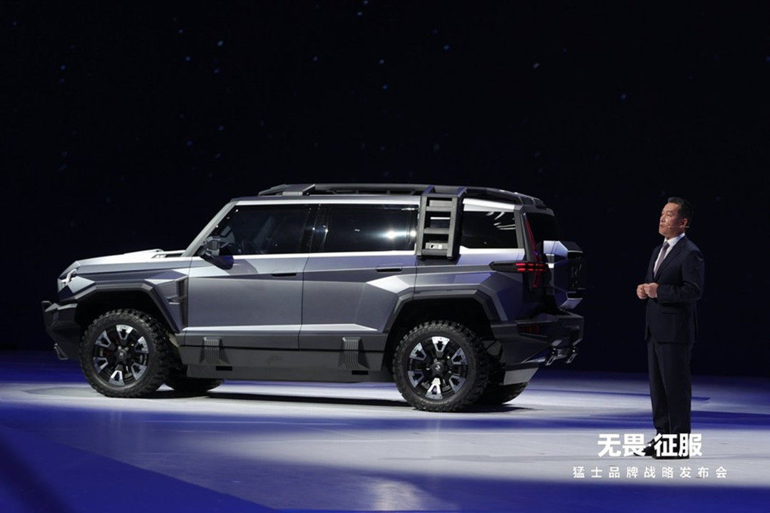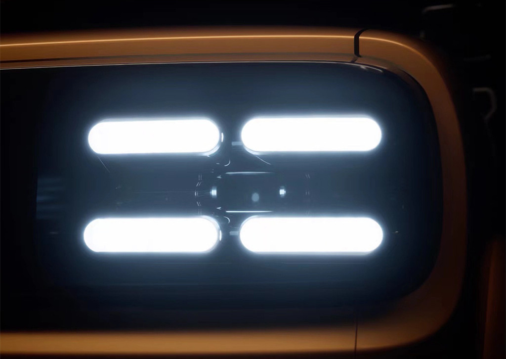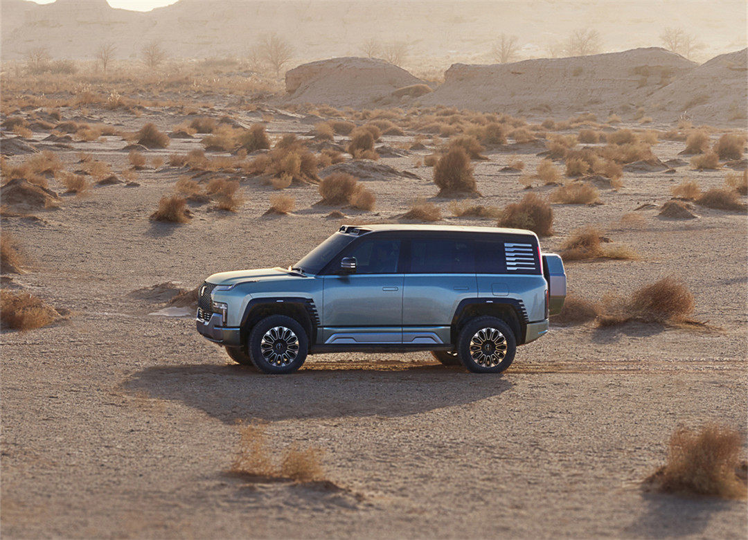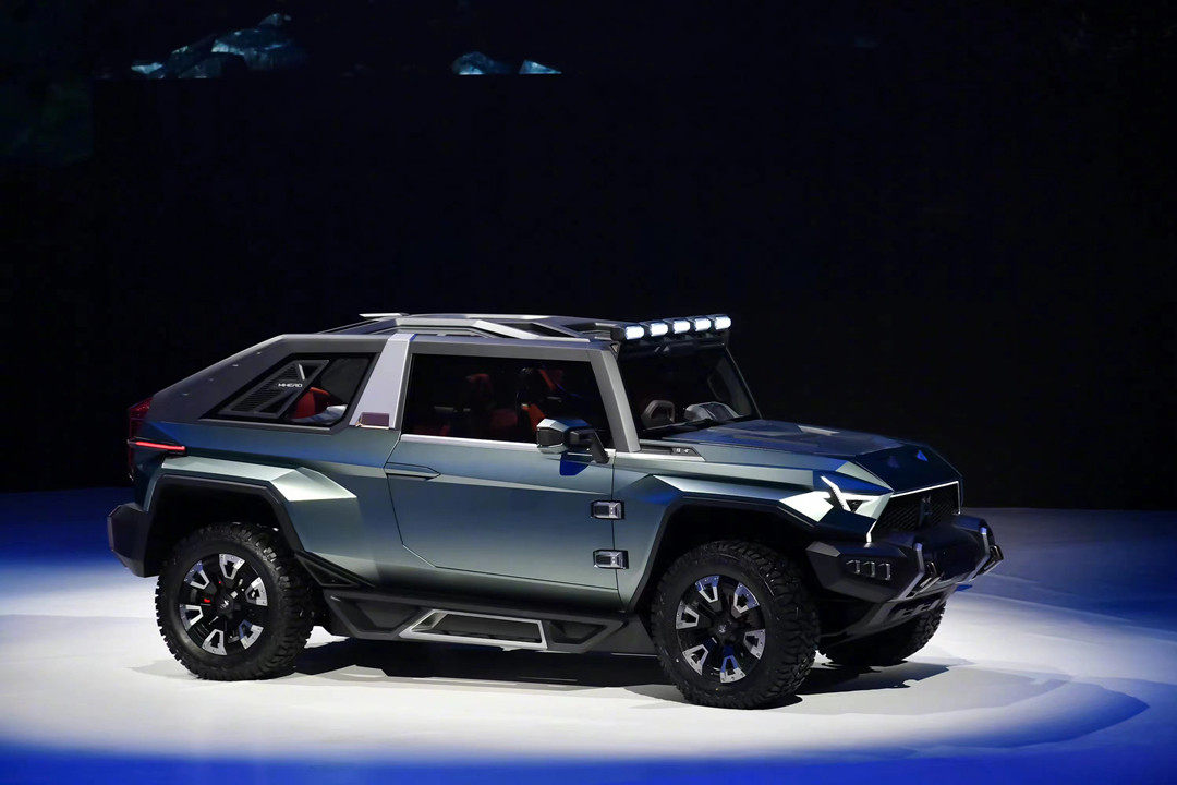 新车的尺寸比路虎卫士大了一圈,采用非承载式车身结构,独有的悬架技术取代了空气悬架,由四轮四电机的独立驱动,提供纯电和插电式混合动力系统,配备刀片电池。