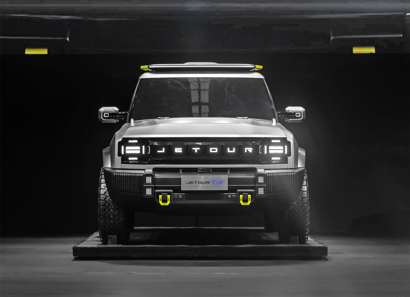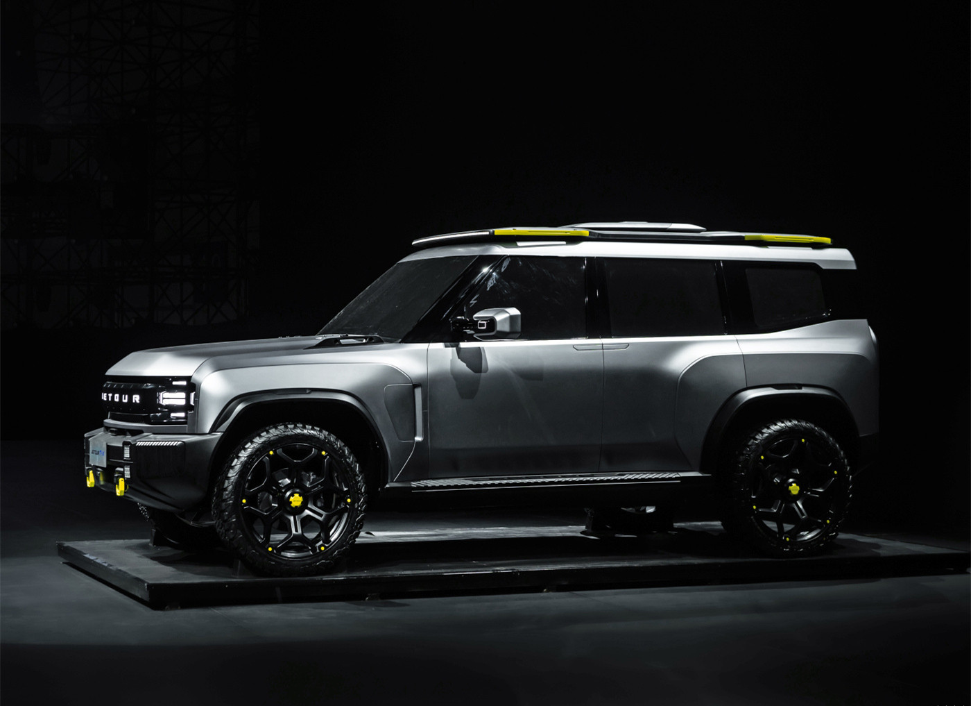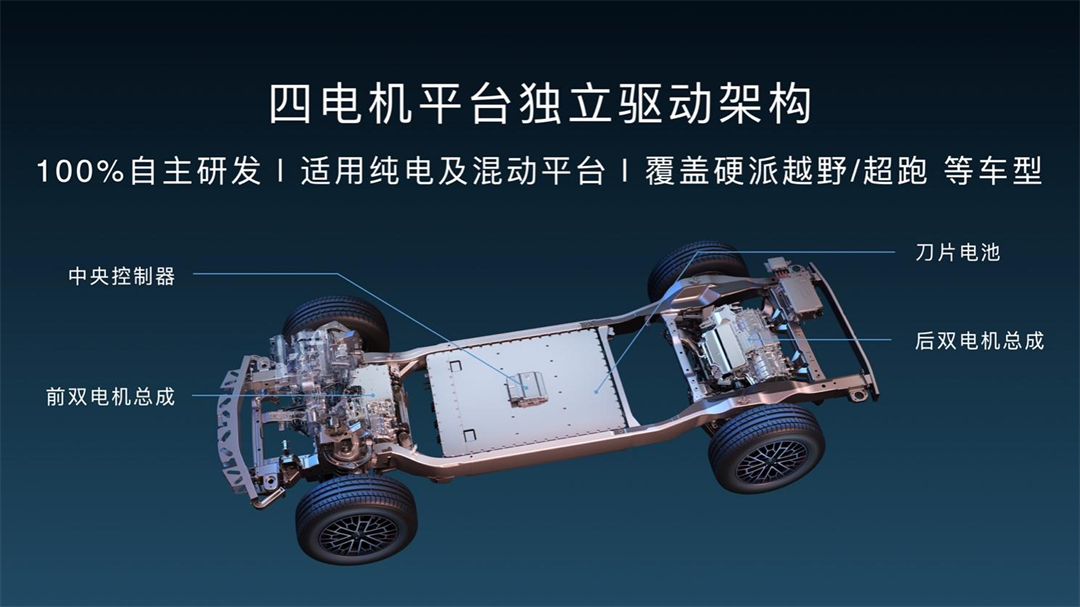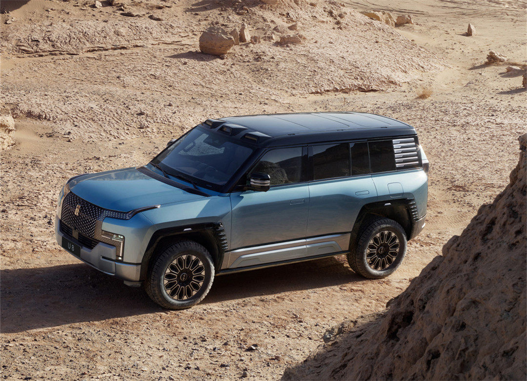 新车的尺寸比路虎卫士大了一圈,采用非承载式车身结构,独有的悬架技术取代了空气悬架,由四轮四电机的独立驱动,提供纯电和插电式混合动力系统,配备刀片电池。