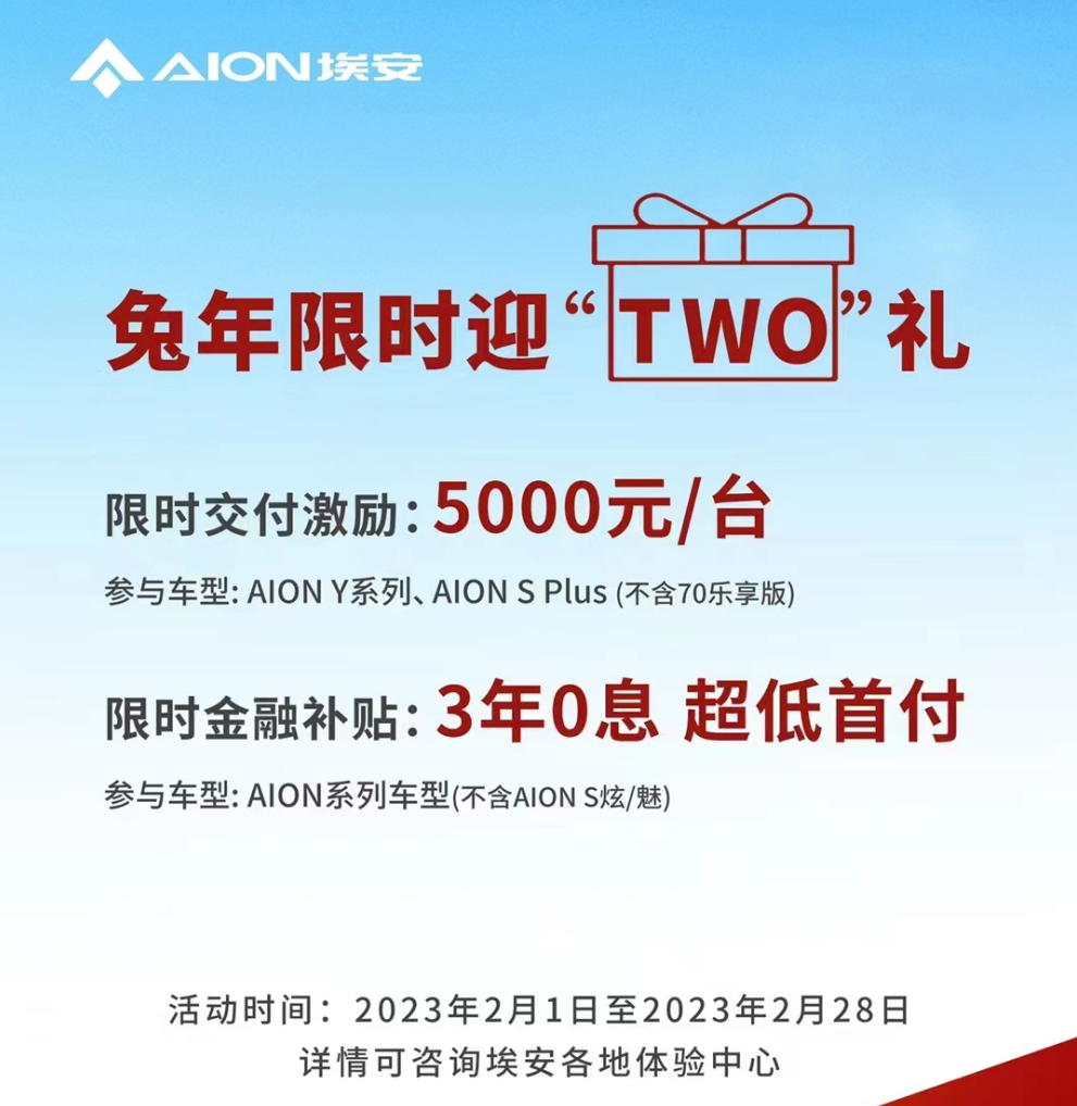 面对特斯拉展现出的嚣张态度,广汽埃安率先表示不服,并且同样以降价迎战。它在2月1日发布了兔年限时迎“TWO”礼活动,面向AION Y、AION S Plus(不含70乐享版)等主销车型推出了5000元/台限时交付激励。